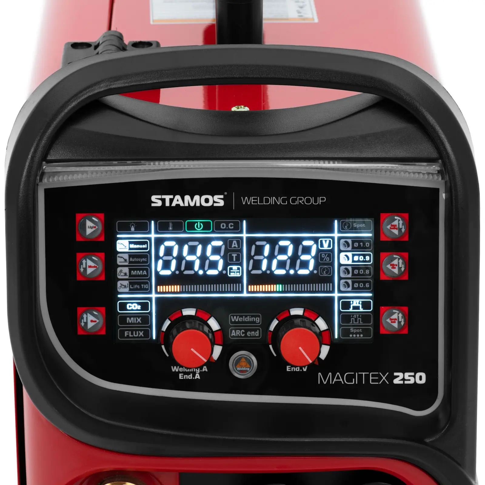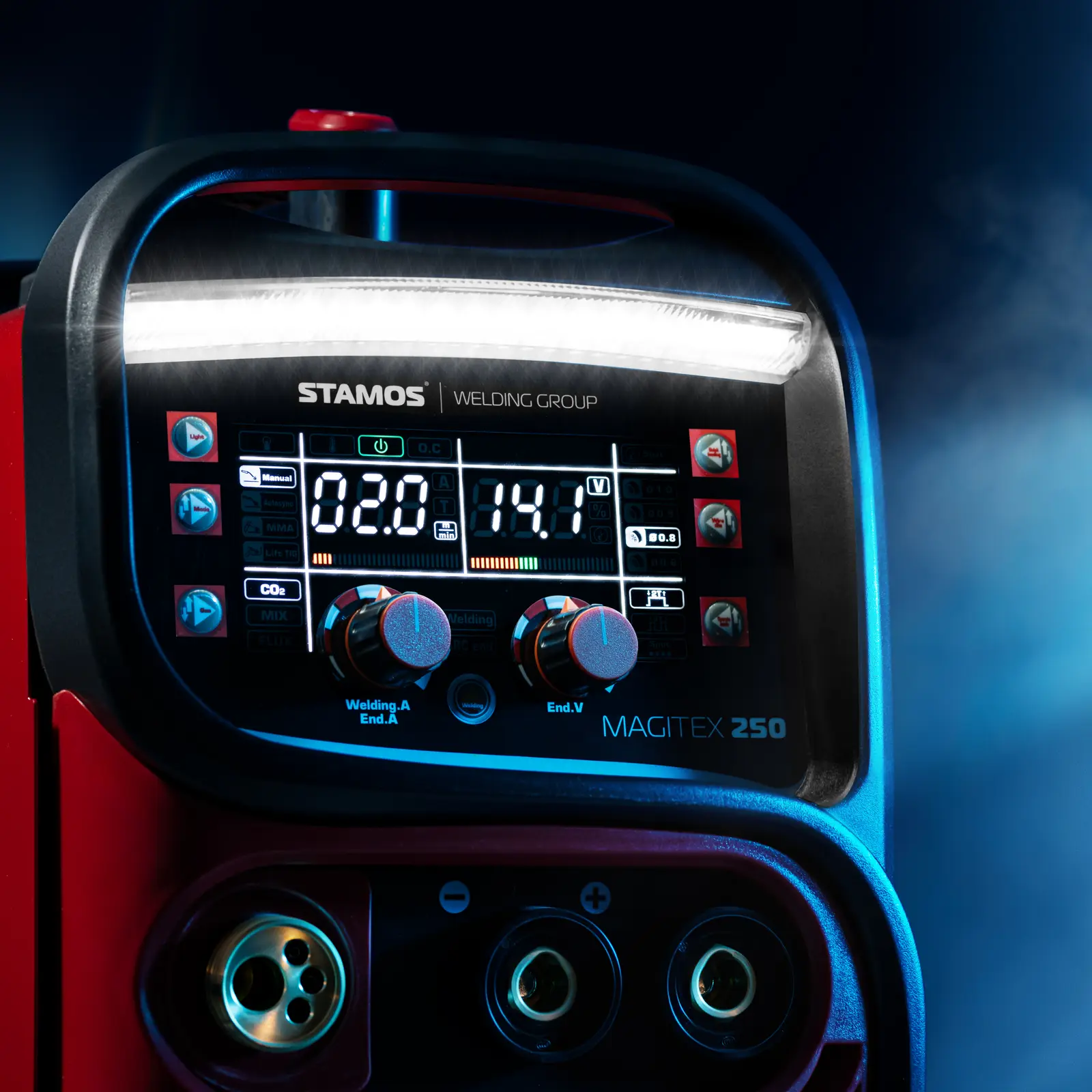 Spawarka MIG/MAG MAGITEX 250 marki Stamos wykorzystuje najnowszą technologię inwerterową IGBT i oferuje najwyższy poziom wszechstronności i jakości. Płynna regulacja prądu spawania do 250 A zapewnia optymalne spoiny przy wielu różnych zadaniach. Spawając drutem, można wybrać pomiędzy drutem litym, do którego potrzebny jest gaz osłonowy lub drutem rdzeniowym bez dodatkowego gazu. Migomat jest uzupełniony o opcję spawania MMA, co pozwala na bezproblemowe korzystanie z niej na zewnątrz w wietrznych warunkach. Do dyspozycji jest też możliwość pracy z metodą TIG Liftarc. Wszystkie wartości robocze są zawsze widoczne na przejrzystym panelu sterowania. Równie łatwy jest wybór metody spawania pomiędzy MIG/MAG, z drutem samoosłonowym (FLUX), TIG Liftarc i MMA, a także przełączanie pomiędzy trybami 2T i 4T. Przy pełnej mocy spawarka MIG osiąga 250 A i 60% cykl pracy. Posiada też zintegrowany schowek na szpulę z drutem. W zależności od rodzaju i średnicy drutu spawalniczego odpowiedni tryb wybierany jest na panelu sterowania lub włączany tryb SYNC, aby parametry zostały dobrane automatycznie. Spawanie MIG wykorzystuje gazy obojętne do miedzi, magnezu i innych metali nieżelaznych oraz ich stopów. Z kolei do metody MAG potrzebny jest gaz aktywny, aby optymalnie łączyć stal konstrukcyjną, stal i większości ich stopów. Do spawania bez gazu osłonowego, należy użyć drutu rdzeniowego i wybrać tryb FLUX. Metoda TIG w tym modelu wykorzystuje zajarzenie Liftarc do aktywacji łuku. W przypadku spawania punktowego należy wybrać funkcję SPOT na wyświetlaczu. Za pomocą panelu łatwo określić natężenie prądu do 200 A. Tryb spawania MMA wykorzystuje się głównie do spawania żelaza lub miedzi, a także stopów, takich jak żeliwo lub stal. Ponieważ do spawania elektrodą otuloną nie potrzeba gazu, urządzenia można użyć także w wymagających warunkach, takich jak wiatr. Funkcja Arc Force zapewnia optymalne rezultaty dzięki stabilnemu łukowi.