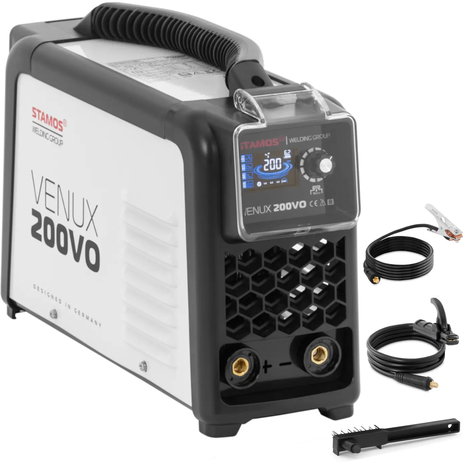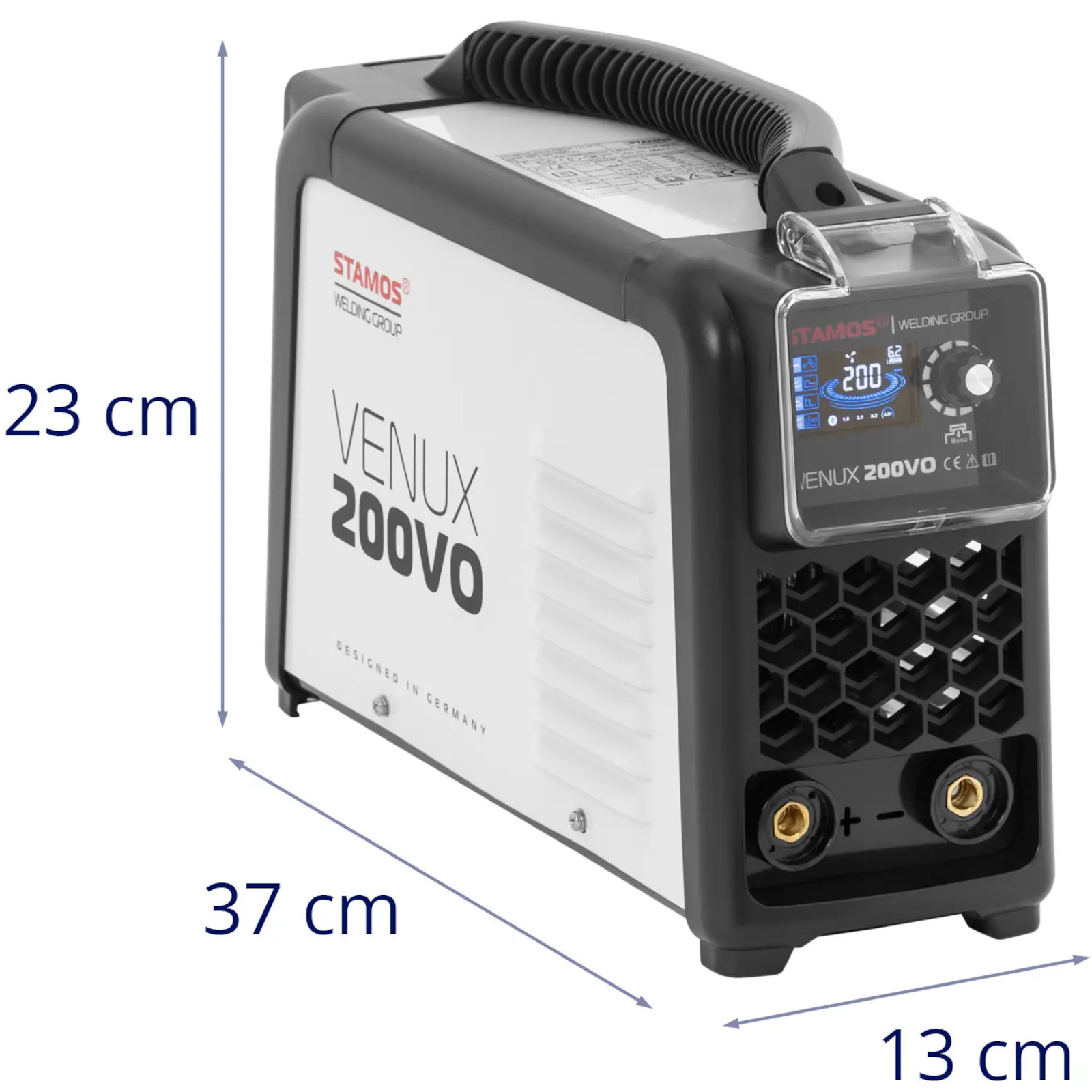 Spawarka MMA marki Stamos Germany sprawdzi się placu budowy, w warsztacie czy garażu. Zachwyca efektywnymi parametrami w kompaktowej obudowie. Urządzenie opiera się na nowoczesnej technologii inwerterowej IGBT, która niezawodnie i szybko przełącza wszystkie parametry. Aby spawać z gazem osłonowym należy wybrać tryb TIG Liftarc i podłączyć odpowiedni uchwyt spawalniczy (brak w zestawie). Pozwala to jeszcze wygodniej i efektywniej korzystać ze spawarki. Wyświetlacz LED i pokrętła precyzyjnie ustawiają prąd spawania do 140 A oraz przełączają się na tryb pracy TIG Liftarc. Ponadto spawarka MMA pozwala równomiernie łączyć metalowe elementy przy cyklu pracy 60%. Wybrany prąd spawania odpowiada średnicy elektrody, którą wykorzystuje się do pracy. Funkcje Hot Start i Anti-Stick zapewniają wysokiej jakości spoiny. Hot Start na krótko zwiększa prąd spawania na początku, dzięki czemu uzyskuje się optymalne łączenia. Anti-Stick zapobiega za to przywieraniu elektrody. Oznacza to, że zawsze osiąga się czyste efekty spawania, bez nadmiernego tworzenia się żużla i odprysków. Uchwyt pozwala łatwo przenieść spawarkę. Urządzenia można użyć do metali takich jak stal, żelazo, żeliwo, nikiel, miedź czy stopy miedzi. Spawarka wykazuje się doskonałą wydajnością przy każdym zadaniu, nawet na zewnątrz. Wytrzymała stalowa obudowa jest szczególnie odporna nawet w wymagających warunkach.