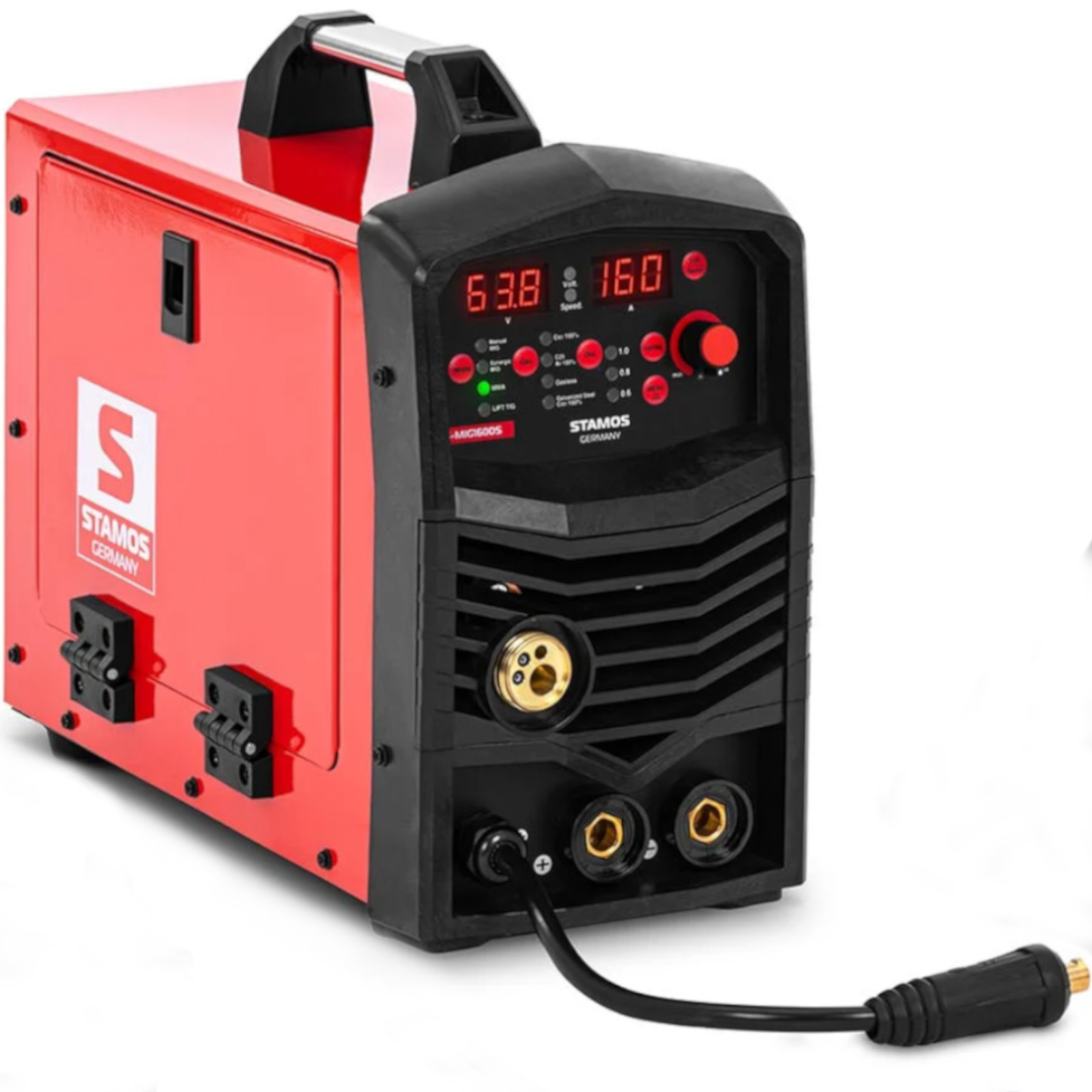 Spawarka MIG/MAG marki Stamos Germany dzięki najnowszej technologii inwertorowej IGBT to kompaktowy migomat z synergią o szerokim zakresie parametrów spawania. Maszyna obsługuje też palnik TIG Liftarc (brak w zestawie). Jeśli chcesz spawać bez gazu, to sprzęt sprawdzi się też jako spawarka elektrodowa lub skorzystaj z drutu proszkowego. Panel sterowania oprócz metody spawania pozwala wybrać liczne opcje, takie jak rodzaj drutu lub rozmiar drutu do spawania. Funkcja synergii pozwala optymalnie skoordynować wszystkie parametry i osiągnąć pierwszorzędne wyniki podczas pracy.