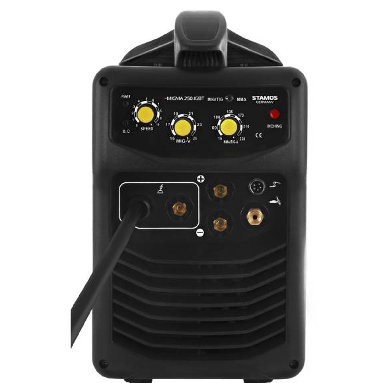 Wielofunkcyjny półautomat spawalniczy od Stamos Germany pozwoli na obróbkę metalowych elementów, dzięki możliwości pracy w trybach MIG, MAG, FCAW, TIG oraz MMA. S-MIGMA 250.IGBT, dzięki bezstopniowej regulacji prądu spawania (max 250 A) umożliwia precyzyjne określenie właściwej wartości, co wpływa na zwiększenie wygody pracy.