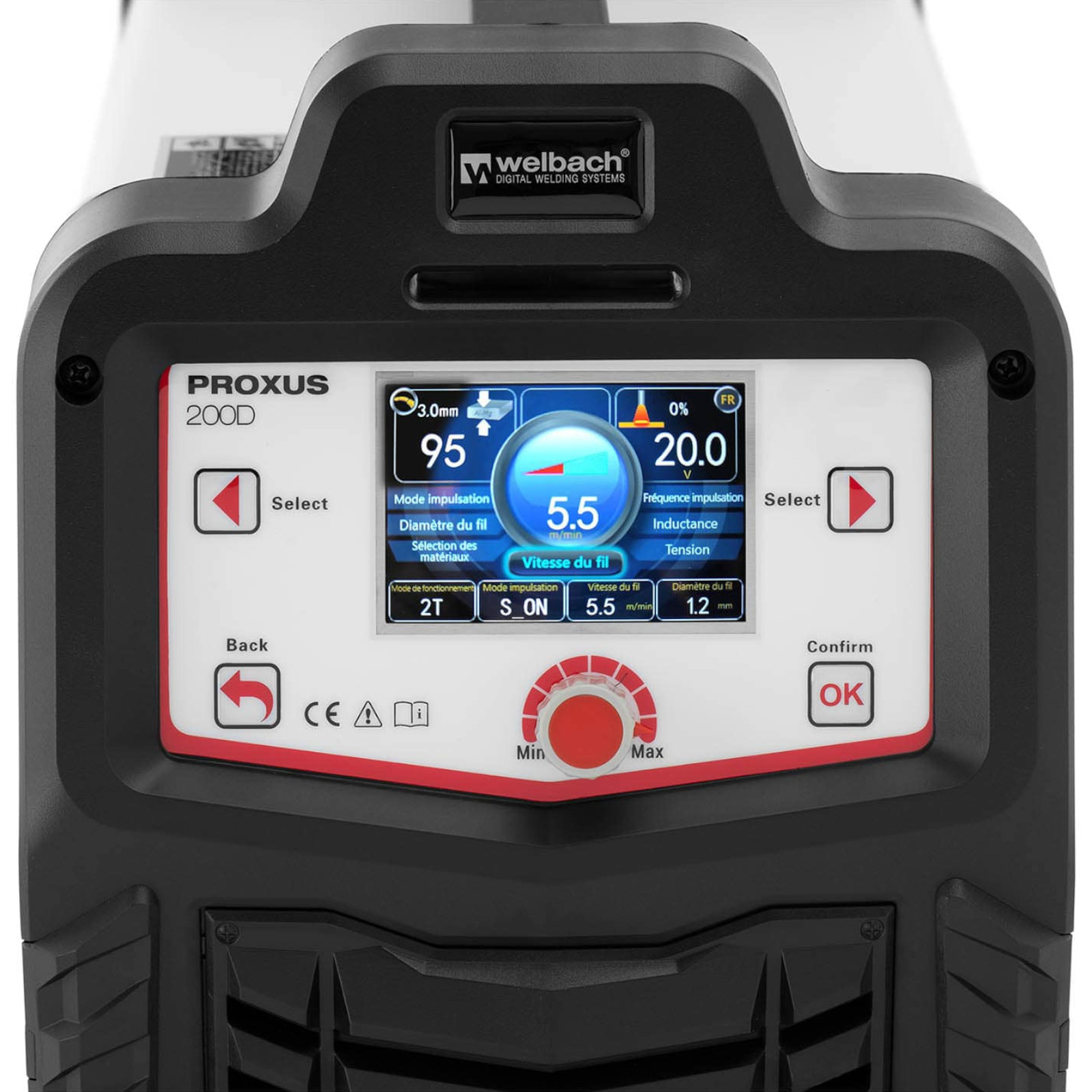- – Czytelny panel sterowania z dużym wyświetlaczem LCD i wstępnie zainstalowanym językiem angielskim, niemieckim, francuskim i szwedzkim, funkcją synergii i zaawansowanym inwertorem IGBT,