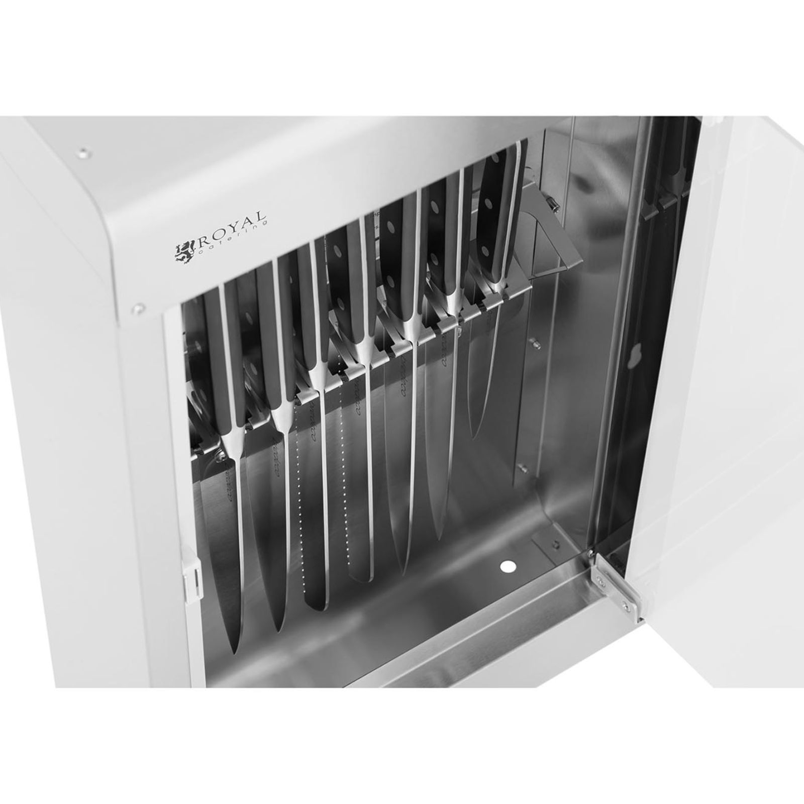 Profesjonalny sterylizator do noży marki Royal Catering służy do dokładnego odkażania ostrzy w szybki i łatwy sposób. Sprzęt idealnie nadaje się do restauracji, hoteli czy barów. Pojemna komora zmieści do 14 noży. Sterylizator wykonano z bardzo mocnej stali nierdzewnej, natomiast drzwiczki z mocnego pleksiglasu, a na jego powierzchni umieszczono specjalny filtr. Urządzenie posiada timer, którym ustawisz czas pracy naświetlacza UV nawet do 60 min.