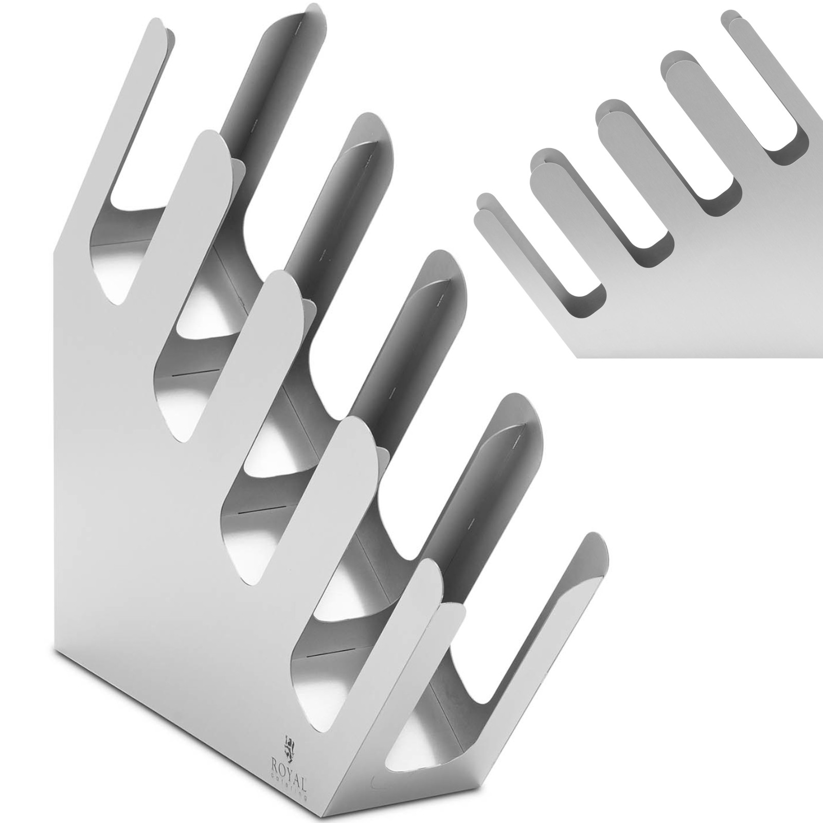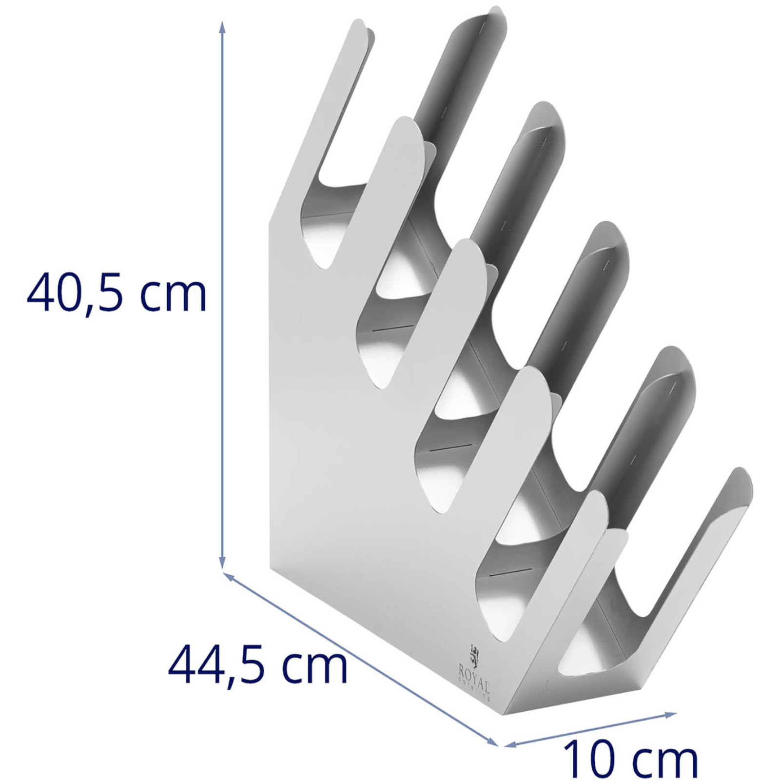 Stojak na kubki i pokrywki marki Royal Catering sprawdzi się do oferowania na wynos napojów. Idealny na stoiska z przekąskami, w salach konferencyjnych, poczekalniach czy w biurze. Organizer ma 4 przegródki na kubki i pasujące wieczka. Pokrywki mogą mieć średnicę do 100 mm. Stojak wykonany został ze stali nierdzewnej, jest trwały i łatwy w czyszczeniu.