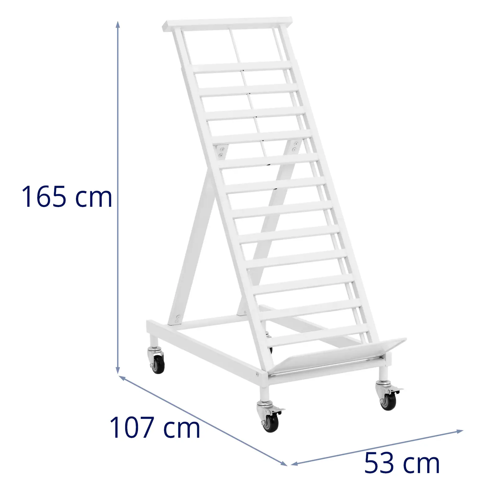 Stojak marki Royal Catering sprawdzi się do prezentowania skrzynek z warzywami czy owocami. Jest to solidny regał wykonany z aluminium, jest mobilny i oferuje miejsce na cztery skrzynki o głębokości 30 cm każda. Idealnie sprawdzi się więc do sprzedaży wewnątrz i na zewnątrz. Dzięki pochylonej ramie cały asortyment jest dobrze widoczny i stoi stabilnie. Antypoślizgowa ochrona na dole regału utrzymuje skrzynki bezpiecznie na miejscu. Dzięki czterem skrętnym kółkom, każde o średnicy 12,5 cm, można przesunąć stojak w wybrane miejsce. Dwa hamulce zapewniają bezpieczną pozycję. Aluminiowa konstrukcja jest łatwa w montażu. Wysokość regału można dostosować zgodnie z liczbą skrzynek do wyeksponowania. Stojak można rozłożyć na żądanej wysokości: 104 cm, 124 cm, 128 cm lub 156 cm. Mebel został zaprojektowany do profesjonalnego i regularnego użytku i imponuje długą żywotnością.