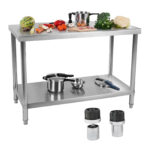 Stół gastronomiczny Royal Catering ze stali szlachetnej idealnie nadaje się do pracy w kuchni, ponieważ wykorzystany materiał nie wchodzi w reakcję w żywnością oraz jest znany ze swojej wytrzymałości. Szeroki blat roboczy o wymiarach 120 x 70 cm pozwoli na wygodne przygotowywanie potraw, a zamontowana półka może służyć do przechowywania sprzętu kuchennego.