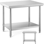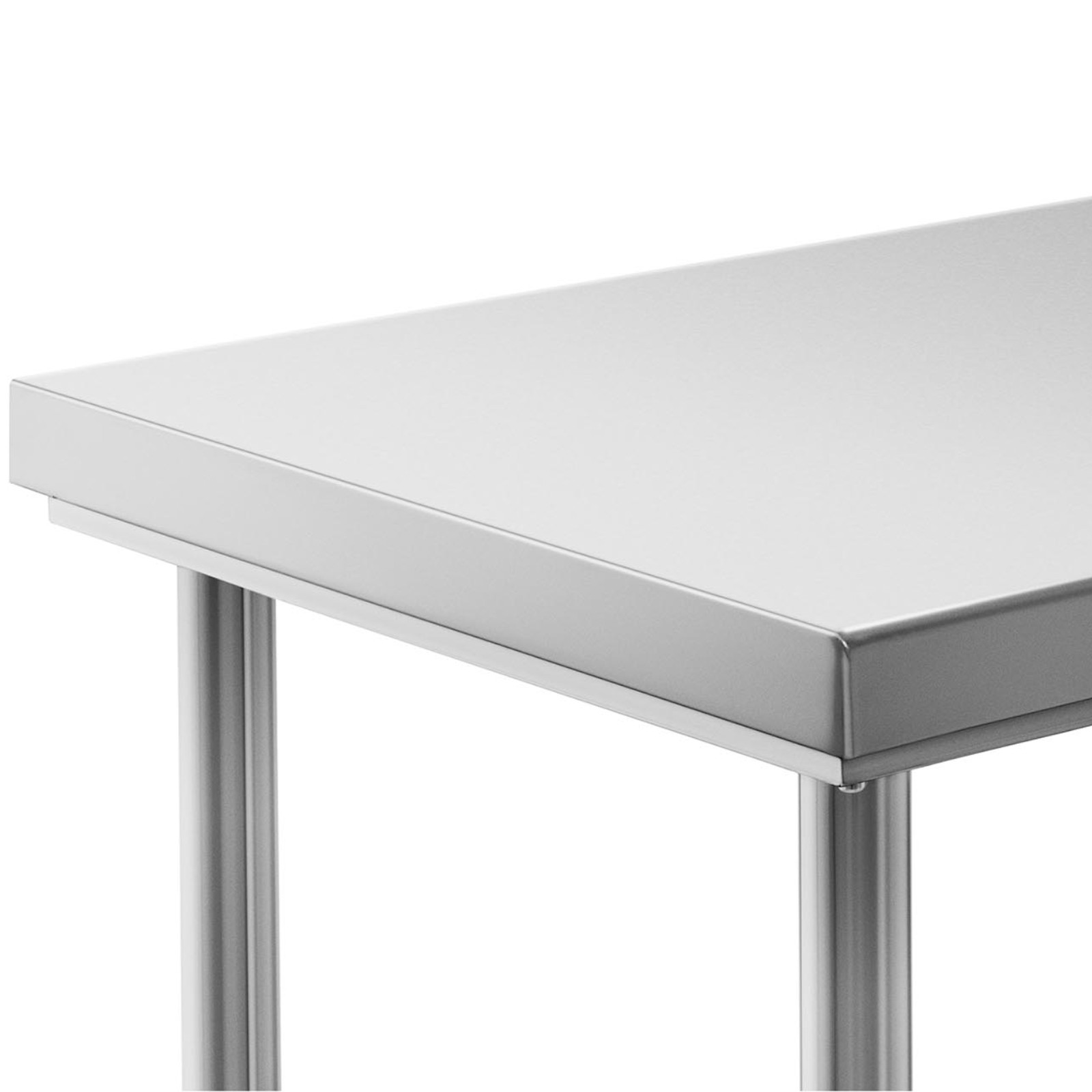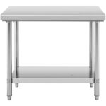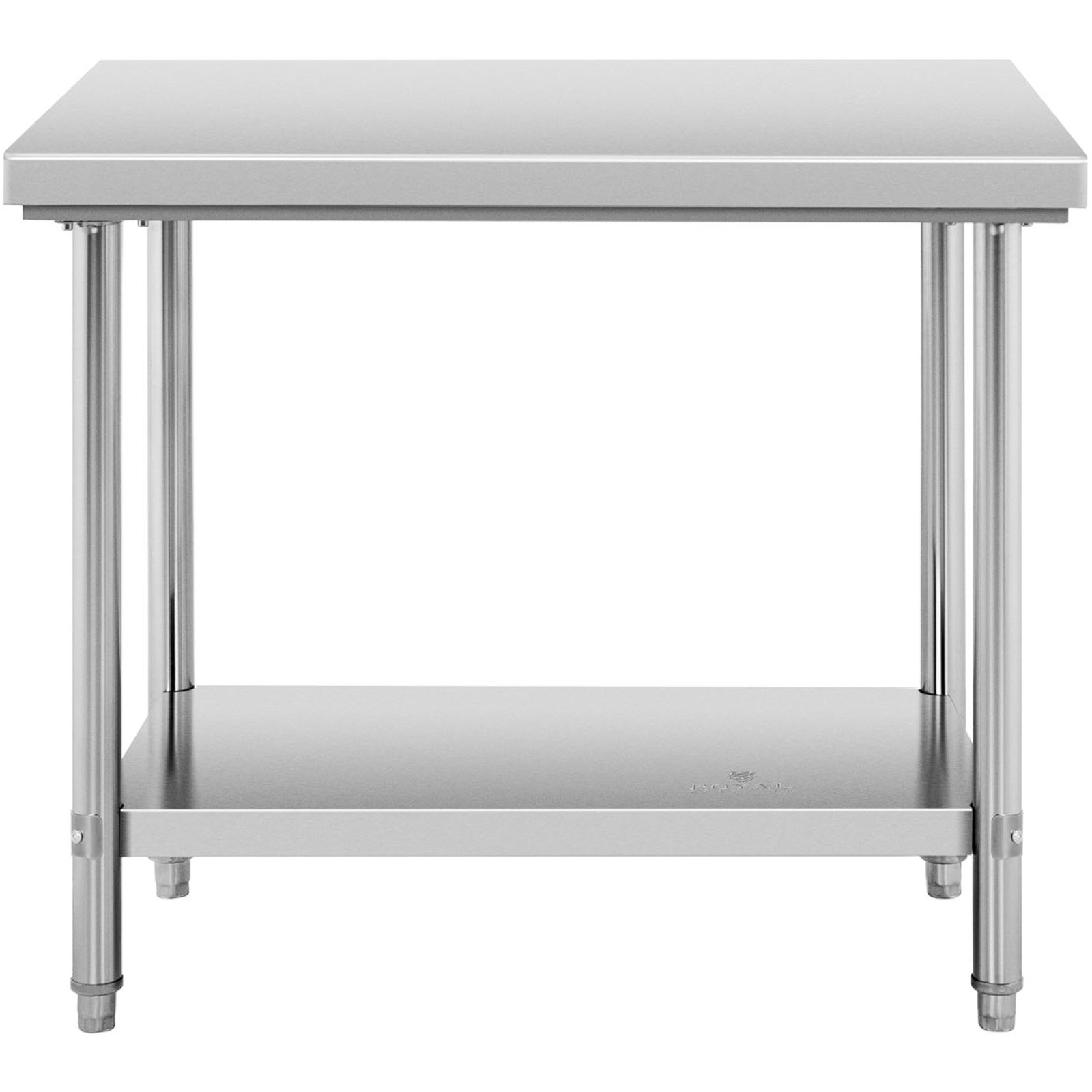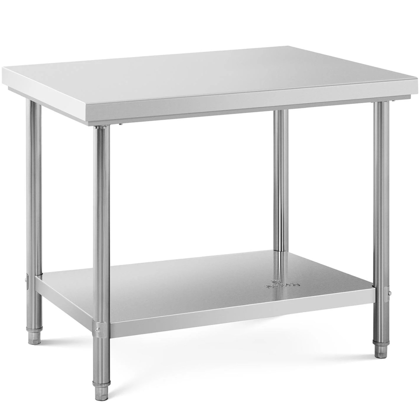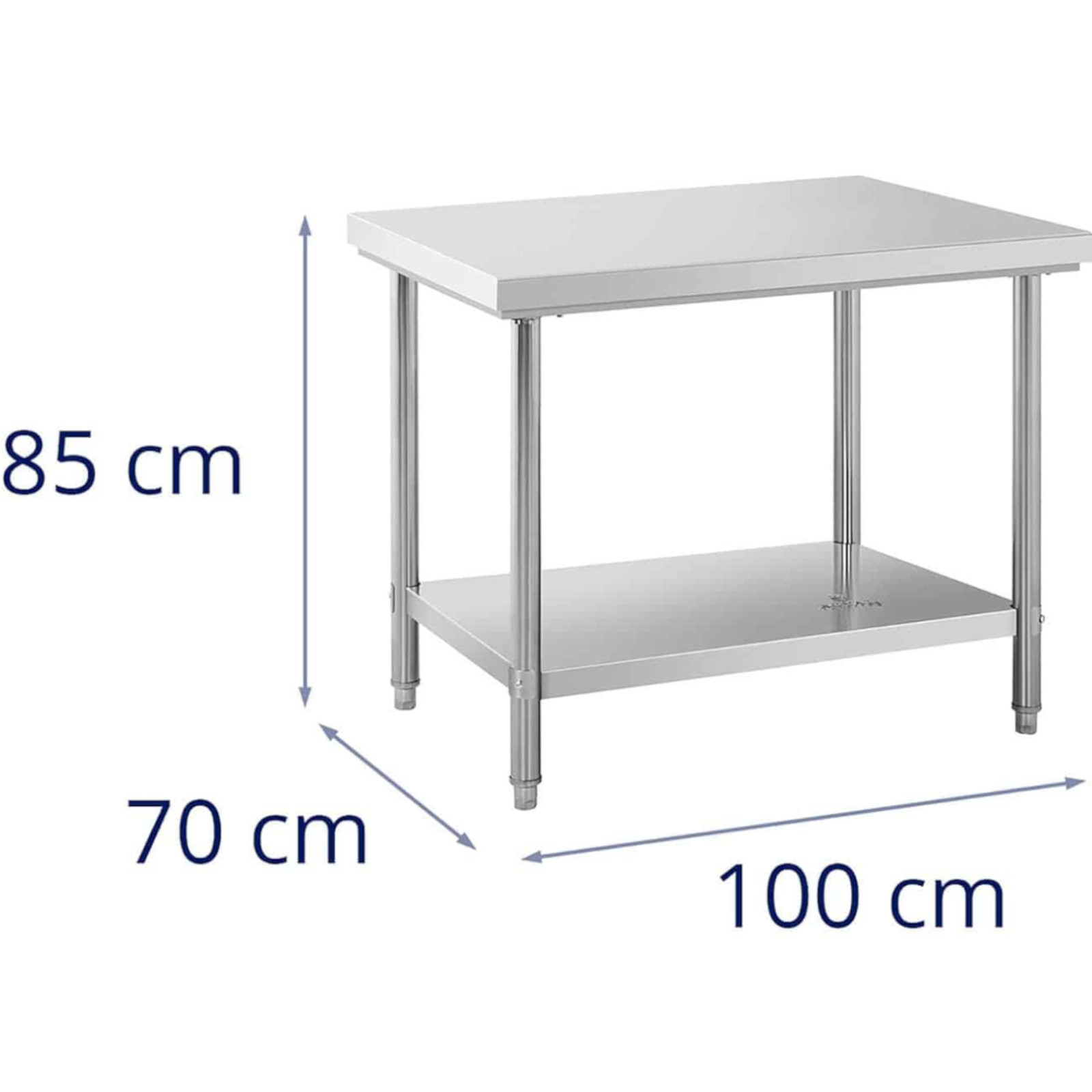 Stół roboczy ze stali nierdzewnej marki Royal Catering sprawdzi się w każdej profesjonalnej kuchni. Został specjalnie zaprojektowany z myślą o wysokich wymaganiach w branży gastronomicznej. Dzięki swojej dwupoziomowej konstrukcji oferuje dodatkową przestrzeń magazynową. Powierzchnia robocza stołu ze stali nierdzewnej ma wymiary 100 x 70 cm i zapewnia dużo miejsca do codziennej pracy. Drugi, niższy poziom służy jako dodatkowa powierzchnia magazynowa, która umożliwia uporządkowaną, przejrzystą pracę. Dolna półka pozwala przechować również duże przedmioty o wysokości do 60 cm. Nóżki są regulowane 20 mm, co zapewnia stabilność nawet na nierównych powierzchniach. Dzięki szybkiemu i łatwemu montażowi za pomocą akcesoriów w zestawie stół gastronomiczny jest szybko gotowy do użycia. Solidne, okrągłe nogi stołu o średnicy 48 mm stabilizują i zwiększają maksymalny udźwig wynoszący 120 kg. Stół został wykonany z polerowanej stali nierdzewnej – zachwyca wysoką wytrzymałością, długą żywotnością oraz jest odporny na korozję i uszkodzenia mechaniczne (np. zarysowania). Materiał można łatwo i dokładnie wyczyścić, dzięki czemu stwarza idealne warunki do higienicznej pracy z żywnością.