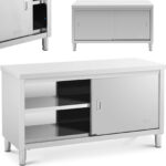 Stół gastronomiczny marki Royal Catering sprawdzi się w restauracjach, hotelach, stołówkach, sklepach itp. Powierzchnia robocza wynosi 150 x 60 cm. Duża szafka zapewnia dodatkową przestrzeń do przechowywania przyborów kuchennych. Zamykana jest przesuwnymi drzwiami, które zajmują niewiele miejsca, są bezpieczne w użyciu i zapewniają łatwy dostęp do wnętrza. Mebel wykonany został ze stali nierdzewnej, jest odporny na uszkodzenia i trwałe zabrudzenia. Jego konstrukcja wytrzymuje obciążenie do 600 kg.