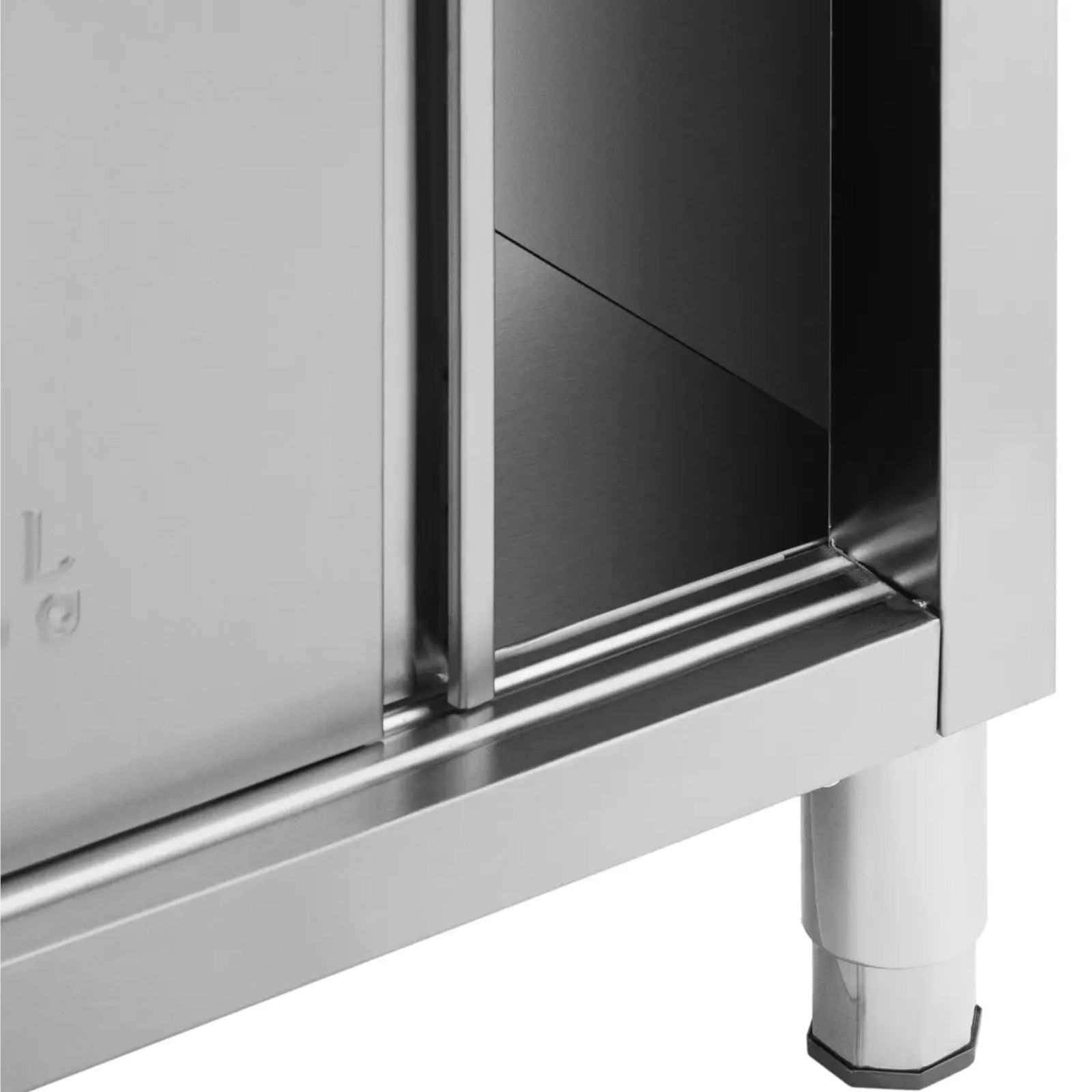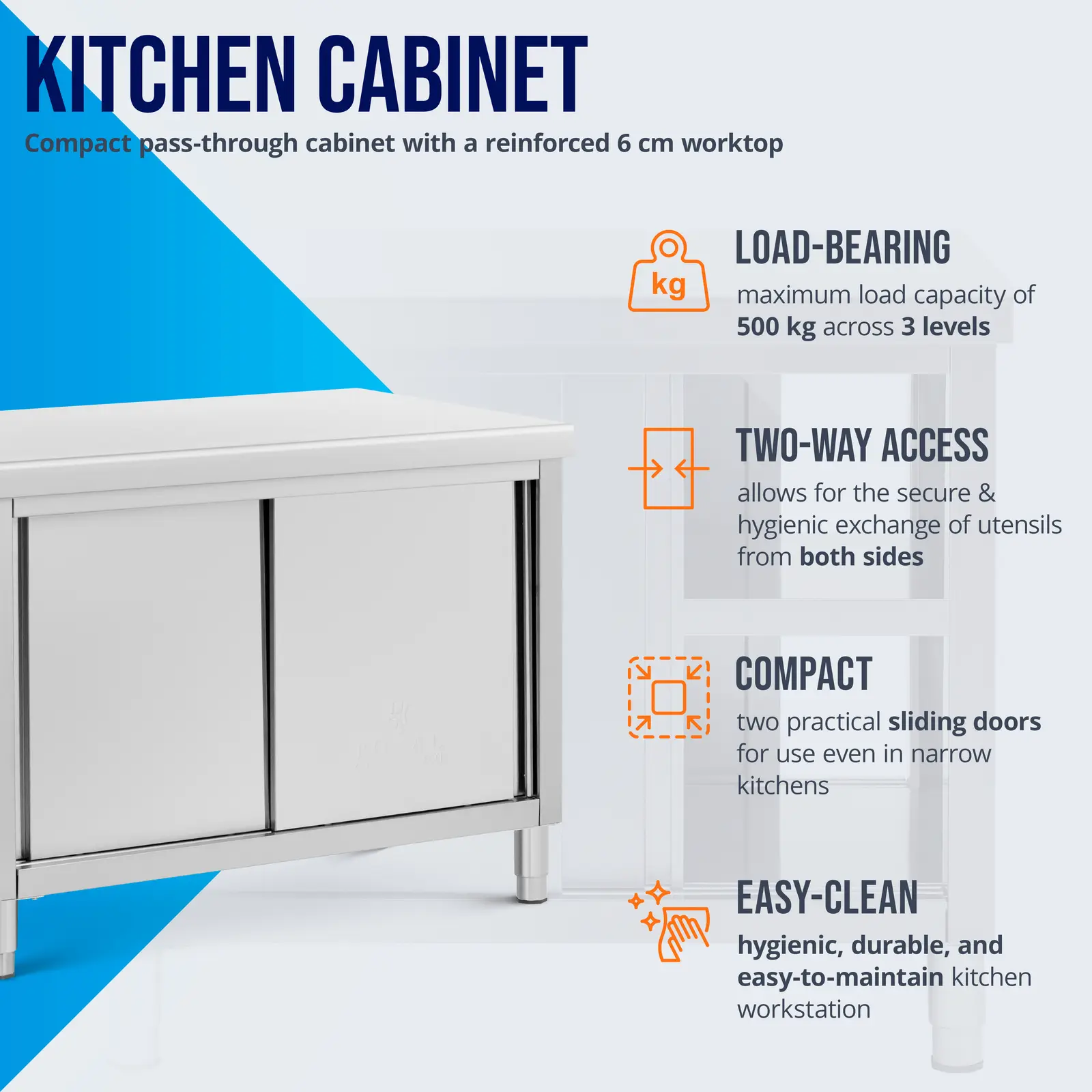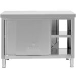 Stół roboczy z szafką marki Royal Catering to profesjonalne wyposażenie dla profesjonalnej kuchni. Sprawdzi się w restauracjach, stołówkach, hotelach czy w piekarniach. Spełnia wysokie wymagania branży gastronomicznej. Szafka przelotowa umożliwia szybki dostęp z obu stron, dzięki czemu łatwo wymienić wszelkiego rodzaju przybory kuchenne. Mebel stoi na nóżkach, które są regulowane w zakresie do 20 mm, dla większej stabilności nawet na nierównej podłodze. Powierzchnia robocza o wymiarach 120 x 70 cm zapewnia miejsce na codzienną pracę. Przemyślane połączenie blatu roboczego ze wzmocnioną płytą MDF oraz szafki do przechowywania zapewnia szerokie zastosowanie i łatwość w utrzymaniu porządku w kuchni. Wnętrze przedzielone jest solidną półką. Całkowite obciążenie stołu gastronomicznego wynosi 500 kg. Z czego 300 kg przypada na wzmocniony blat, podczas gdy dolne półki zniosą obciążenie po 100 kg. Wykonany z wysokiej jakości stali nierdzewnej stół roboczy zachwyca dużą wytrzymałością, gwarantuje długą żywotność oraz jest odporny na korozję i uszkodzenia mechaniczne (np. zadrapania). Gładkie powierzchnie są łatwe w czyszczeniu. Dzięki temu mebel spełnia wymogi higienicznej pracy z żywnością.