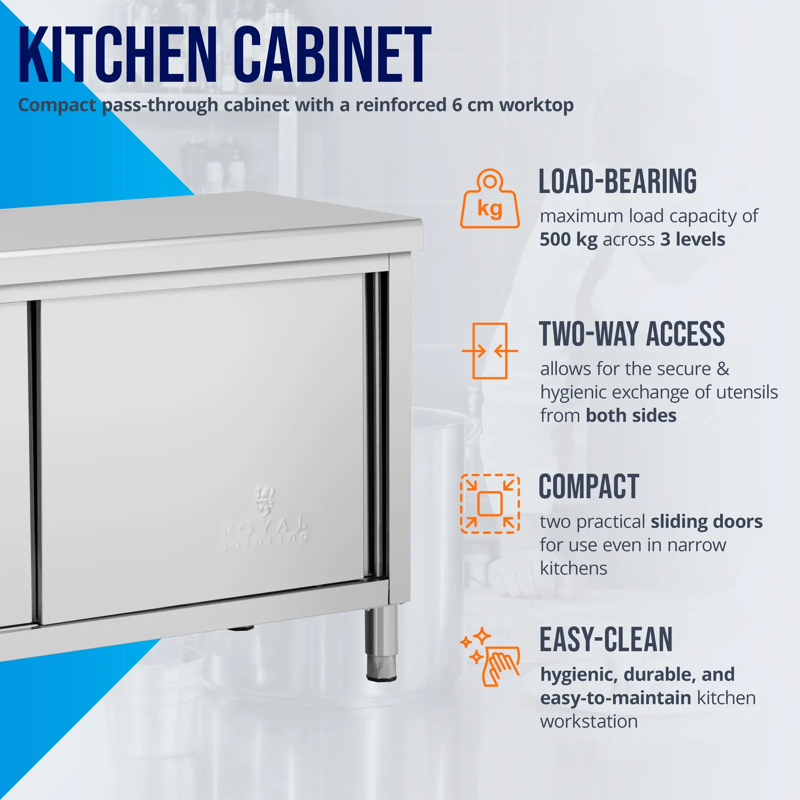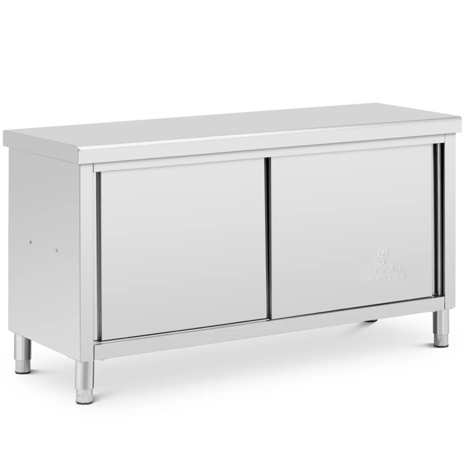 Stół roboczy z szafką marki Royal Catering to profesjonalne wyposażenie dla profesjonalnej kuchni. Sprawdzi się w restauracjach, stołówkach, hotelach czy w piekarniach. Spełnia wysokie wymagania branży gastronomicznej. Szafka przelotowa umożliwia szybki dostęp z obu stron, dzięki czemu łatwo wymienić wszelkiego rodzaju przybory kuchenne. Mebel stoi na nóżkach, które są regulowane w zakresie do 20 mm, dla większej stabilności nawet na nierównej podłodze. Powierzchnia robocza o wymiarach 160 x 60 cm zapewnia miejsce na codzienną pracę. Przemyślane połączenie blatu roboczego ze wzmocnioną płytą MDF oraz szafki do przechowywania zapewnia szerokie zastosowanie i łatwość w utrzymaniu porządku w kuchni. Wnętrze przedzielone jest solidną półką. Całkowite obciążenie stołu gastronomicznego wynosi 500 kg. Z czego 300 kg przypada na wzmocniony blat, podczas gdy dolne półki zniosą obciążenie po 100 kg. Wykonany z wysokiej jakości stali nierdzewnej stół roboczy zachwyca dużą wytrzymałością, gwarantuje długą żywotność oraz jest odporny na korozję i uszkodzenia mechaniczne (np. zadrapania). Gładkie powierzchnie są łatwe w czyszczeniu. Dzięki temu mebel spełnia wymogi higienicznej pracy z żywnością.