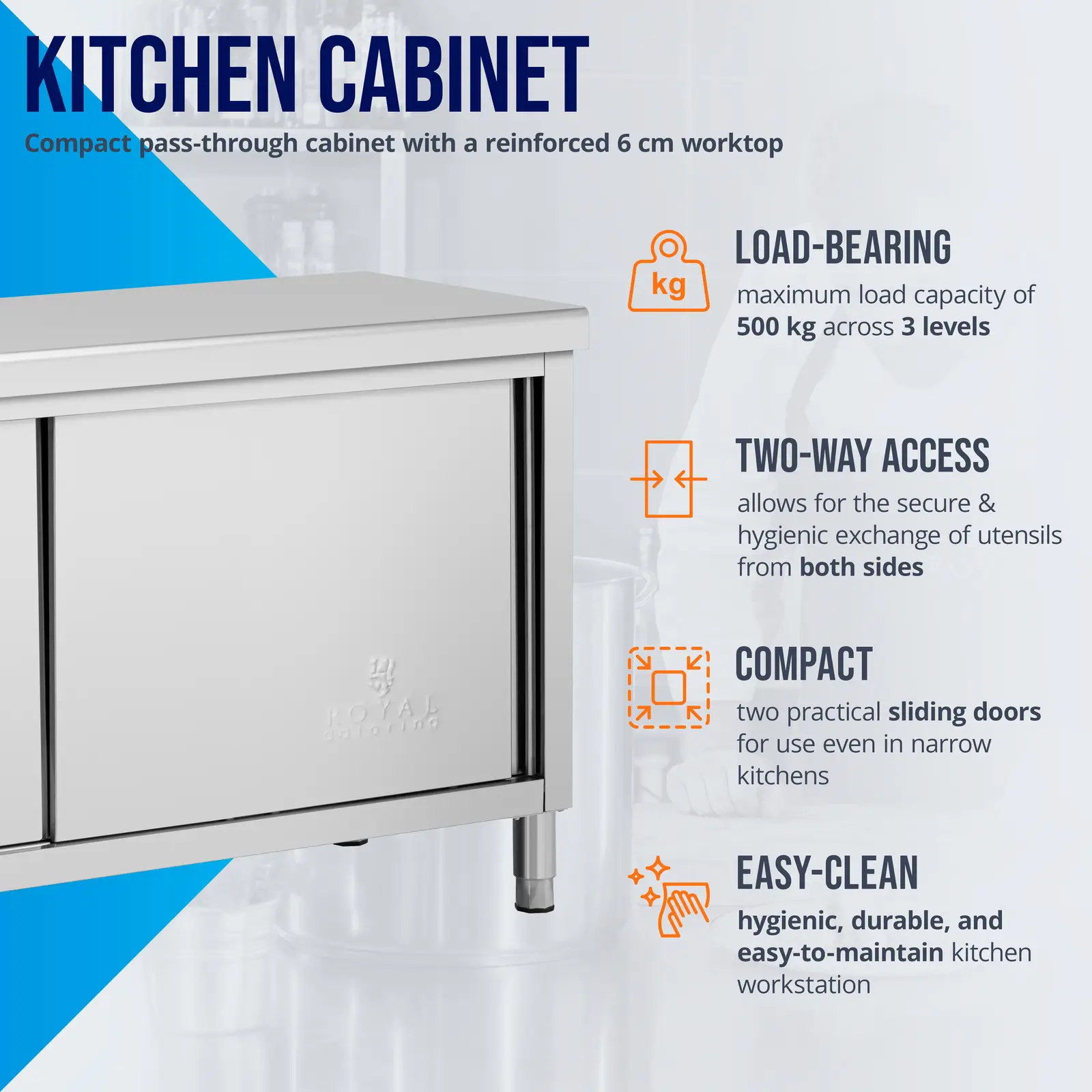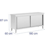 Stół roboczy z szafką marki Royal Catering to profesjonalne wyposażenie dla profesjonalnej kuchni. Sprawdzi się w restauracjach, stołówkach, hotelach czy w piekarniach. Spełnia wysokie wymagania branży gastronomicznej. Szafka przelotowa umożliwia szybki dostęp z obu stron, dzięki czemu łatwo wymienić wszelkiego rodzaju przybory kuchenne. Mebel stoi na nóżkach, które są regulowane w zakresie do 20 mm, dla większej stabilności nawet na nierównej podłodze. Powierzchnia robocza o wymiarach 100 x 60 cm zapewnia miejsce na codzienną pracę. Przemyślane połączenie blatu roboczego ze wzmocnioną płytą MDF oraz szafki do przechowywania zapewnia szerokie zastosowanie i łatwość w utrzymaniu porządku w kuchni. Wnętrze przedzielone jest solidną półką. Całkowite obciążenie stołu gastronomicznego wynosi 500 kg. Z czego 300 kg przypada na wzmocniony blat, podczas gdy dolne półki zniosą obciążenie po 100 kg. Wykonany z wysokiej jakości stali nierdzewnej stół roboczy zachwyca dużą wytrzymałością, gwarantuje długą żywotność oraz jest odporny na korozję i uszkodzenia mechaniczne (np. zadrapania). Gładkie powierzchnie są łatwe w czyszczeniu. Dzięki temu mebel spełnia wymogi higienicznej pracy z żywnością.