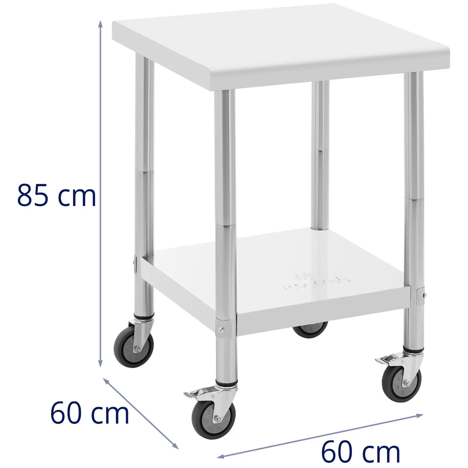 Stół marki Royal Catering sprawdzi się w każdej profesjonalnie urządzonej kuchni. Wykonany został ze stali nierdzewnej i specjalnie zaprojektowany, aby sprostać wysokim wymaganiom branży gastronomicznej. Dzięki swojej dwupoziomowej konstrukcji oferuje dodatkową powierzchnię magazynową. 4 kółka, z czego 2 z hamulcami – zapewniają mobilność i elastyczne użytkowanie stołu. Powierzchnia robocza wynosi 60 x 60 cm i oferuje dużo miejsca do codziennej pracy. Wysokości mebla wynosi 85 cm. Drugi poziom 48 x 48 cm o wysokości 53 cm służy jako dodatkowa przestrzeń do przechowywania. Nośność dolnego blatu wynosi 50 kg a nośność całkowita 120 kg. Dostarczone akcesoria zapewniają szybki i łatwy montaż. Masywne, okrągłe nogi stołu o średnicy 48 mm stabilizują i zwiększają maksymalną nośność. Stół zachwyca wysoką trwałością oraz długą żywotnością. Jest odporny na korozję i uszkodzenia mechaniczne (np. zarysowania) oraz jest łatwy w czyszczeniu.