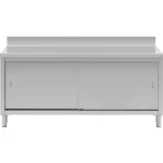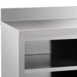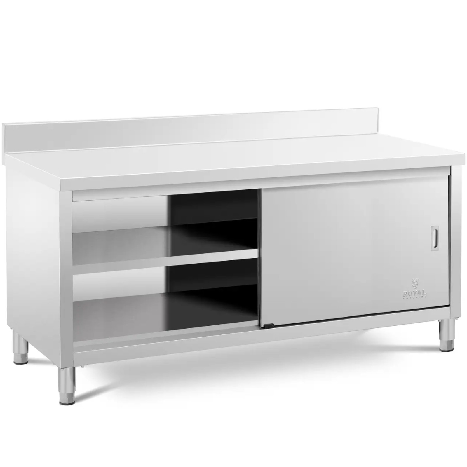 Stół roboczy z szafką marki Royal Catering zapewnia dodatkową przestrzeń do pracy i przechowywania przyborów kuchennych oraz składników do potraw. Sprawdzi się w restauracjach, hotelach, stołówkach, a także w szpitalach i sklepach mięsnych. Duża szafka pomieści wiele sprzętów. Umieszczono w niej pojemną półkę zapewniającą dodatkową przestrzeń do przechowywania. Szafka jest zamykana przesuwnymi drzwiami, które zajmują niewiele miejsca, są bezpieczne w użyciu i zapewniają łatwy dostęp do wnętrza. Rant chroni ścianę przed zachlapaniem. Stal nierdzewna z której wykonano mebel jest odporna na uszkodzenia i trwałe zabrudzenia. Nośność mebla wynosi 600 kg.