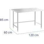 Stół marki Royal Catering został zaprojektowany specjalnie z myślą o wysokich wymaganiach w branży gastronomicznej. Dzięki zredukowanej konstrukcji oferuje dużą powierzchnię na dole i możliwość umieszczenia szafek lub przechowywania przyborów roboczych. Powierzchnia robocza stołu ma 120 x 60 cm i zapewnia dużo miejsca do codziennej pracy. Masywne, okrągłe nogi stołu nierdzewnego o średnicy 48 mm stabilizują i zwiększają maksymalną nośność do 91 kg. Stół wykonany został z polerowanej stali nierdzewnej, jest wytrzymały, odporny na korozję oraz uszkodzenia mechaniczne. Jest także higieniczny oraz łatwy w czyszczeniu.