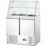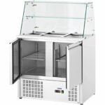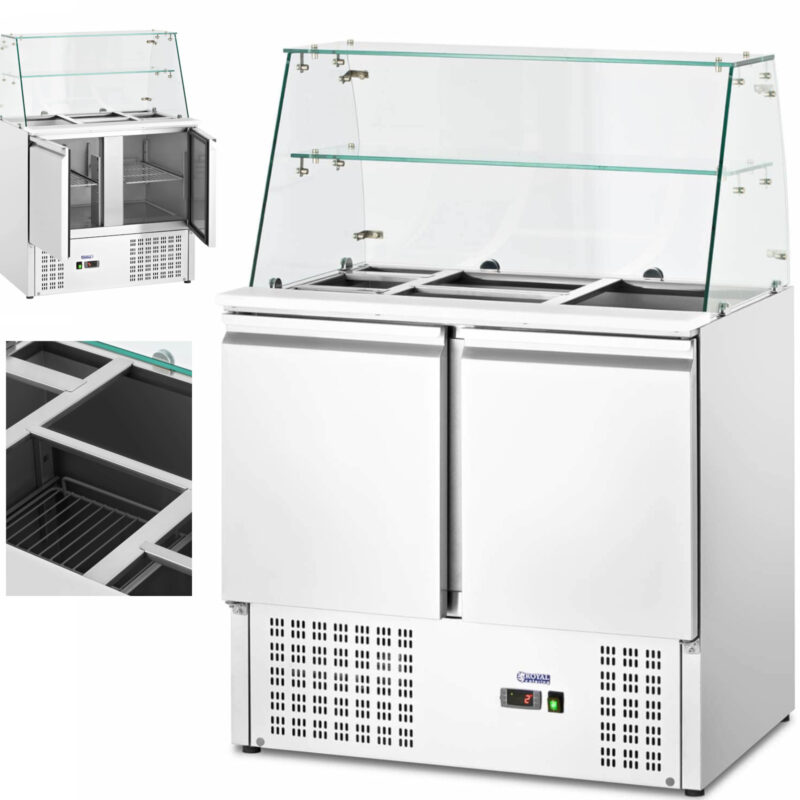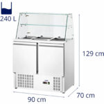 Stół chłodniczy marki Royal Catering jest profesjonalnym urządzeniem chłodzącym stworzonym z myślą o restauracjach, barach szybkiej obsługi czy hotelach. Stół chłodzi w zakresie 2-10°C. Temperatura ustawiana jest za pomocą cyfrowego panelu sterowania. Termostat utrzymuje ją na wskazanym poziomie. Agregat o mocy 235 W zapewnia szybkie osiąganie żądanej temperatury. Urządzenie posiada funkcję automatycznego odszraniania, która zmniejsza koszty energii elektrycznej i oszczędza pracy. Pojemność stołu wynosi 240 l. Lada o długości 90 cm pomieści jeden pojemnik GN 1/1, trzy pojemniki GN 1/2 i trzy pojemniki GN 1/6. Szklana osłona chroni zawartość przed czynnikami zewnętrznymi jednocześnie atrakcyjnie ją prezentując. 2-drzwiowa dolna szafka z dwiema półkami o nośności 30 kg każda oferuje dużo miejsca do przechowywania. Zintegrowana deska do krojenia zapewnia wydajną pracę. Obudowa urządzenia wykonana została ze stali nierdzewnej, jest ona biologicznie obojętna, nie reaguje w kontakcie z żywnością, jest wytrzymała i niewrażliwa na korozję. Nóżki są regulowane w zakresie do 30 mm.