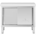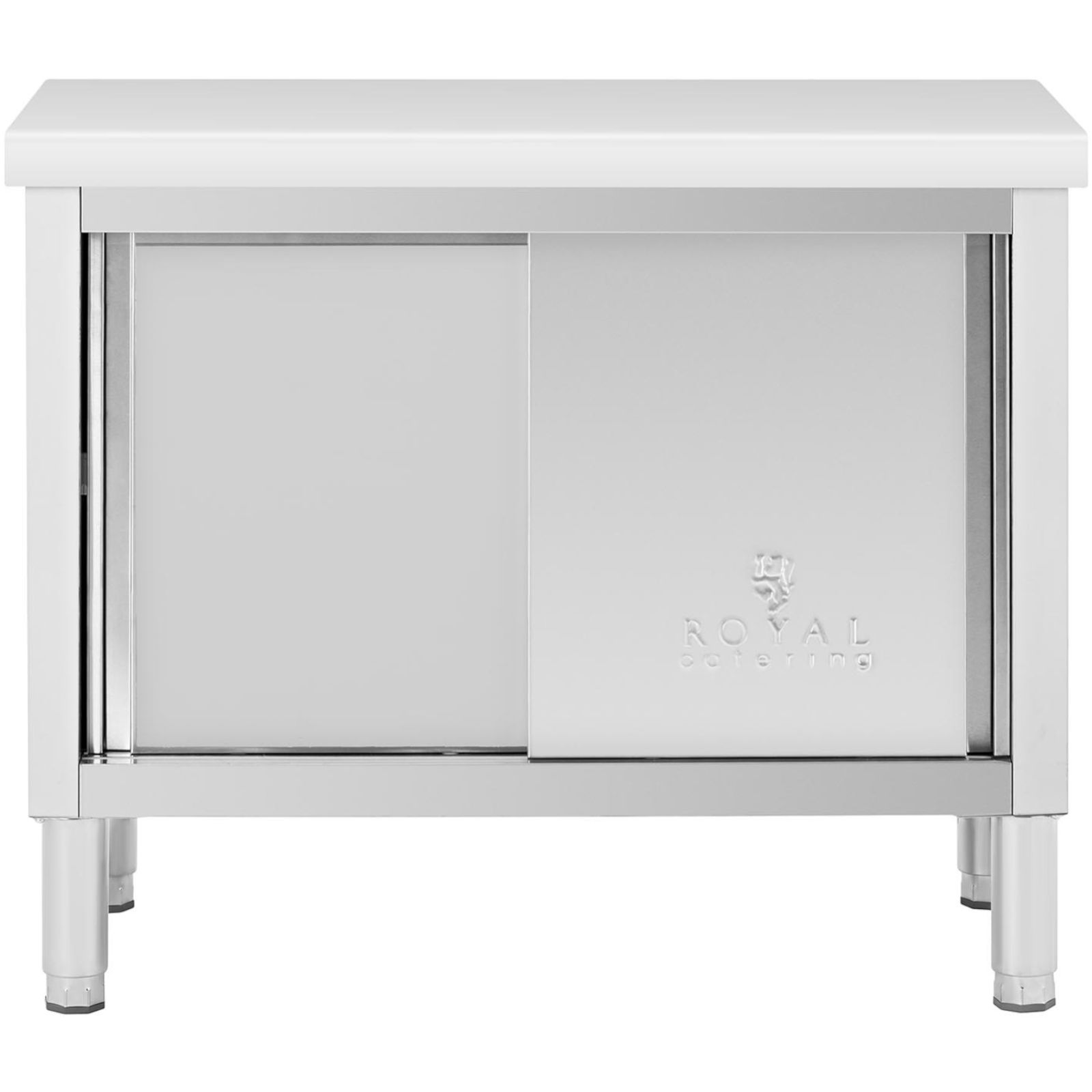Stół gastronomiczny marki Royal Catering ze stali nierdzewnej idealnie nadaje się dla branży gastronomicznej, w restauracji, stołówce, hotelu, piekarni lub kuchni komercyjnej. Wykonany z wysokiej jakości stali nierdzewnej cechuje się dużą wytrzymałością, odpornością na korozję i uszkodzenia mechaniczne. Duży blat o powierzchni 100 x 50 cm i wysokości 85 cm nadaje się do pracy ze świeżą żywnością, suchymi składnikami i sprzętem kuchennym. Dzięki połączeniu blatu i szafki do przechowywania stół umożliwia szeroki zakres zastosowań oraz umożliwia stały porządek w kuchni. Szafka wyposażona w dwoje praktycznych przesuwnych drzwi, zajmuje niewiele miejsca w wąskiej kuchni. Wnętrze szafki składa się z dwóch półek o nośności do 95 kg każda, a nośność całkowita włącznie z blatem roboczym wynosi do 285 kg. Solidna konstrukcja zapewnia stabilność stołu, a wysokiej jakości stal nierdzewna gwarantuje długą żywotność. Materiał można łatwo i dokładnie wyczyścić, dzięki czemu praca z żywnością jest łatwa i higieniczna.