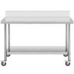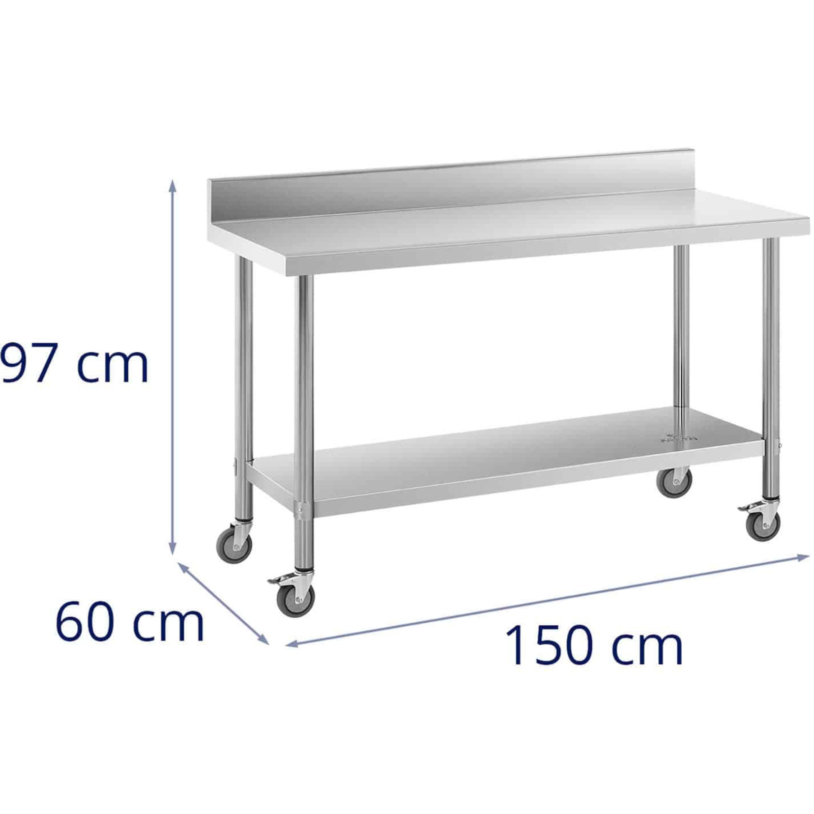 Stół gastronomiczny Royal Catering ze stali nierdzewnej idealnie nadaje się do pracy w kuchni, ponieważ wykorzystany materiał nie wchodzi w reakcję z żywnością oraz jest znany ze swojej wytrzymałości. Szeroki blat roboczy o nośności 90 kg i wymiarach 60 x 150 cm pozwoli na wygodne przygotowywanie potraw na wysokości 85 cm, a dodatkowy rant wysokości 115 mm chroni otoczenie przed rozpryskami wody i brudem. Zamontowana półka o nośności 70 kg i wymiarach 138 x 48 cm, może służyć do przechowywania sprzętu kuchennego wysokości do 53 cm. Stabilny stół osadzono na 4 masywnych okrągłych nogach o średnicy 48 mm, dodatkowo zakończonymi kółkami w tym dwa z hamulcem zwiększają możliwości w zakresie mobilności i zastosowania sprzętu w kuchni. Wysokiej jakości precyzyjna obróbka stołu wykonanego ze stali nierdzewnej charakteryzuje się wysoką odpornością na uszkodzenia mechaniczne, odpornością na korozję, a powierzchnia jest łatwa w utrzymaniu czystości, co stwarza idealne warunki do higienicznej pracy z żywnością.