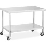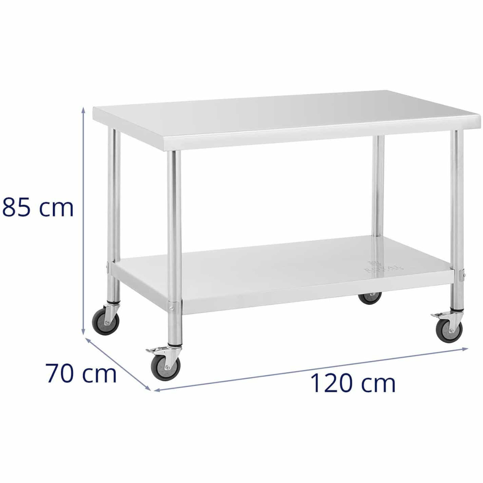 Stół gastronomiczny Royal Catering ze stali nierdzewnej idealnie nadaje się do pracy w kuchni, ponieważ wykorzystany materiał nie wchodzi w reakcję z żywnością oraz jest znany ze swojej wytrzymałości. Szeroki blat roboczy o nośności 98 kg i wymiarach 70 x 120 cm pozwoli na wygodne przygotowywanie potraw na wysokości 85 cm, a zamontowana półka o nośności 60 kg i wymiarach 108 x 58 cm, może służyć do przechowywania sprzętu kuchennego do wysokości 53 cm. Stabilny stół osadzono na 4 masywnych okrągłych nogach o średnicy 48 mm, dodatkowo zakończonymi kółkami w tym dwa z hamulcem co zwiększa możliwości w zakresie mobilności i zastosowania sprzętu w kuchni. Wysokiej jakości precyzyjna obróbka stołu wykonanego ze stali nierdzewnej charakteryzuje wysoką odpornością na uszkodzenia mechaniczne, odpornością na korozję, a powierzchnia jest łatwa w utrzymaniu czystości, co stwarza idealne warunki do higienicznej pracy z żywnością.
