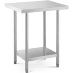 Stół roboczy marki Royal Catering jest przeznaczony do profesjonalnych kuchni. Sprawdzi się w kuchniach hoteli, restauracji, stołówek, w kantynach, pizzeriach oraz piekarniach a także w sklepach mięsnych i rybnych, szkołach, czy szpitalach. Wykonany został ze stali nierdzewnej, odpornej na rdzę oraz uszkodzenia mechaniczne. Blat o wymiarze 76 x 61 cm oraz dodatkowa półka zapewniają wystarczającą ilość miejsca do pracy i przechowywania przyborów kuchennych. Nośność blatu wynosi 200 kg, dolnej półki także 200 kg, łącznie 400 kg. Nóżki są regulowane, co czyni stół bardziej stabilnym nawet na nierównym podłożu.