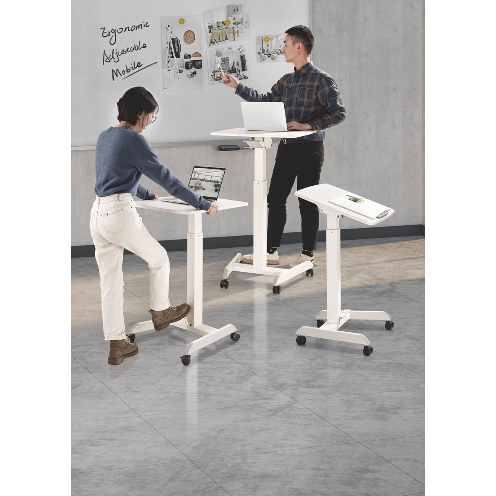 • – Materiał – Blat: tworzywo (ABS, PP), płyta wiórowa (E0) / stelaż: stal (SPCC, SPHC) / kółka: tworzywo (ABS, PP)