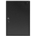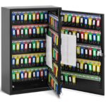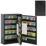Szafka zamykana jest na klucz (2 szt. w zestawie). Skrzynkę można zamocować do ściany za pomocą nawierconych otworów. W środku szafy można przechowywać maks. 200 kluczy. Szafka posiada 200 haczyków a w zestawie znajduje się 200 kolorowych zawieszek oraz papierowe listy do spisania zawartości. Szafka została wykonana z blachy o grubości 0,7 mm i została pokryta matową czarna farbą.