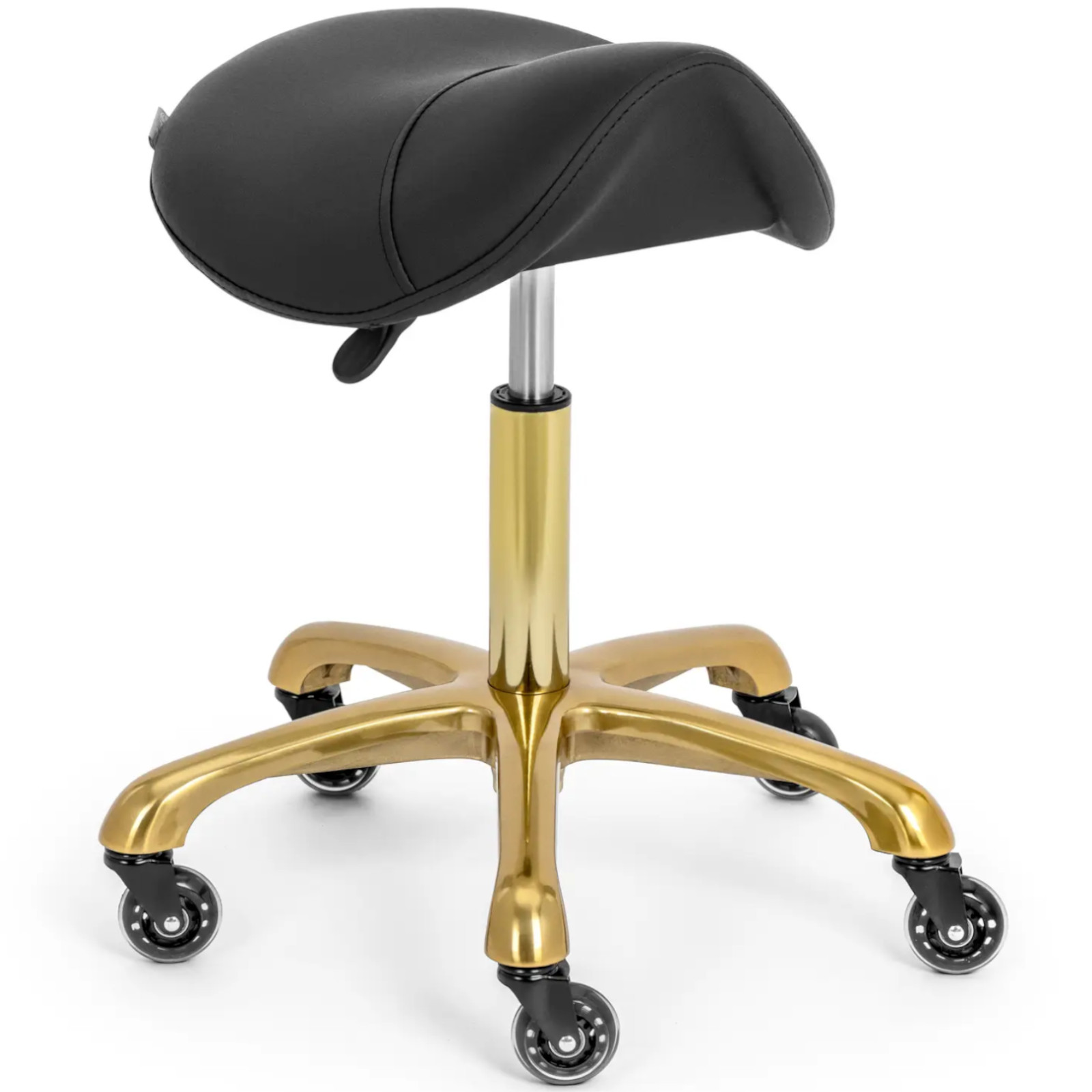 Taboret stołek kosmetyczny siodłowy na kółkach do 150 kg YORK – czarno złoty