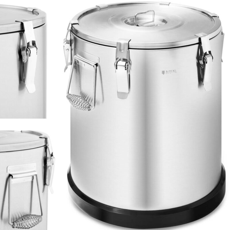 Termos gastronomiczny marki Royal Catering pozwala na bezpieczny transport ciepłych oraz zimnych potraw i napojów. Sprawdzi się w restauracjach, hotelach, stołówkach czy w firmach cateringowych. Termos wykonany został ze stali nierdzewnej, odpornej na wstrząsy i z nowoczesnym wyglądem. Spód pokryty został elastycznym gumowym pierścieniem. Dwuścienna izolacja o grubości 30 mm utrzymuje ciepło do dwóch dni. Pokrywka wyposażona została w sześć zatrzasków. Dwa ergonomiczne uchwyty po bokach umożliwiają wygodne przenoszenie. Powierzchnia pojemnika jest higieniczna, odporna na zanieczyszczenia, zacieki wodne czy resztki jedzenia.