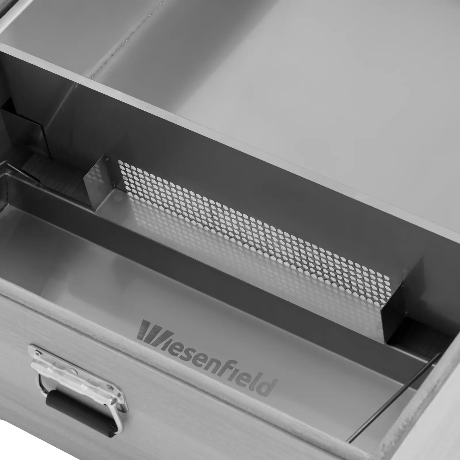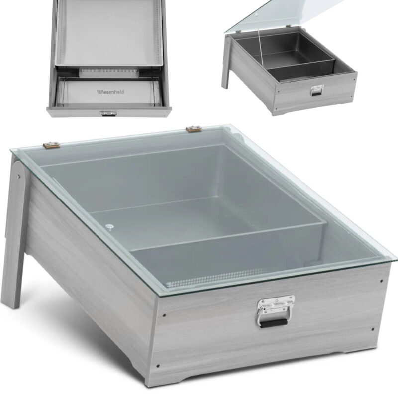 Solarna topiarka do wosku marki Wiesenfield skutecznie wyłapie promienie słoneczne i nagrzeje się do temperatury, w której wosk spłynie z ramek. Wystarczy ustawić skrzynkę, która jest pochylona na dwóch nóżkach, optymalnie w kierunku Słońca i pozwolić jej działać. Ta metoda jest nie tylko ekologiczna, ale także przyjazna dla portfela. Topiarka do wosku składa się z drewnianej skrzynki zamykanej szklaną pokrywą. To pozwala ciepłu słonecznemu dostać się do obudowy i utrzymać jej wnętrze w bezpośrednim nasłonecznieniu. W zestawie znajduje się pojemnik ze stali nierdzewnej o wymiarach 55 x 50 x 15 cm. Oferuje on wystarczająco dużo miejsca na wiele standardowych ramek o mniejszych wymiarach. Otwór prowadzi do tacki ociekowej, w której zbiera się roztopiony wosk. Skrzynka stoi pod niewielkim kątem na dwóch nóżkach, dzięki czemu jest optymalnie ustawiona względem słońca. Szklaną pokrywę otwiera się dzięki płynnie działającym zawiasom i można utrzymać w pozycji otwartej za pomocą praktycznego uchwytu. Po otwarciu bez problemu można wyciągnąć pojemnik na ramki i tackę ociekową. Oba elementy wykonane są z łatwej w pielęgnacji stali nierdzewnej, dzięki czemu można wyczyścić je bez wysiłku. Aby przechowywać skrzynkę, wystarczy złożyć nóżki i wygodnie przetransportować całość za pomocą uchwytu.