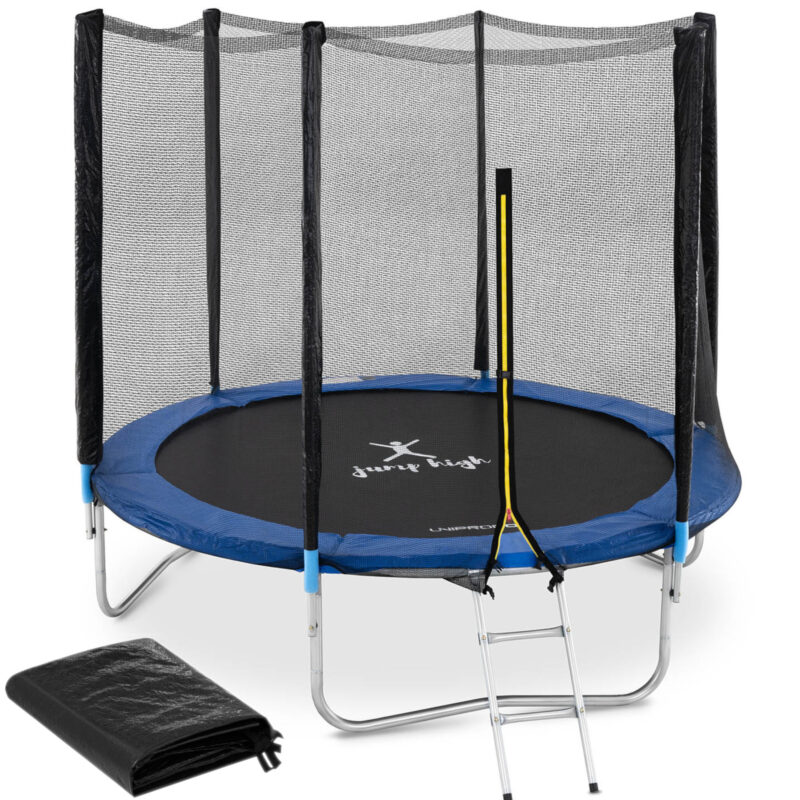 Trampolina marki Gymrex sprawdzi się do zabawy na świeżym powietrzu. Skakanie na trampolinie efektywnie spala kalorie, wzmacnia układ krążenia i nie obciąża stawów. Duże wymiary śr. 244 x 180 cm oraz udźwig do 80 kg pozwalają na zabawę kilkorga dzieci. Duża sprężystość to zasługa 48 wysokiej jakości sprężyn o średnicy 2,9 mm. Trzy stabilne podwójne nogi wykonane zostały z trwałej stali. Matę do skakania wykonano z elastycznego i wytrzymałego polipropylenu. Boczne zapięcia zostały wyściełane pianką o grubości 16 mm i wyposażone w odporną na warunki atmosferyczne osłonę sprężyn wykonaną z polietylenu i PVC. W komplecie znajduje się także pokrowiec przeciwdeszczowy, chroniący przed wiatrem, ubrudzeniem i warunkami atmosferycznymi. Bezpieczeństwo użytkowania zapewnia wyściółka, osłona sprężyn oraz siatka. Dołączona drabinka ułatwia korzystanie z trampoliny.