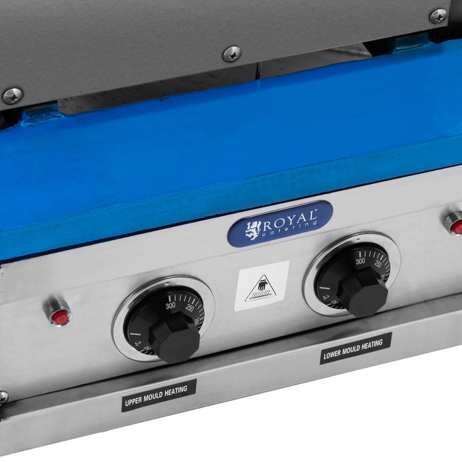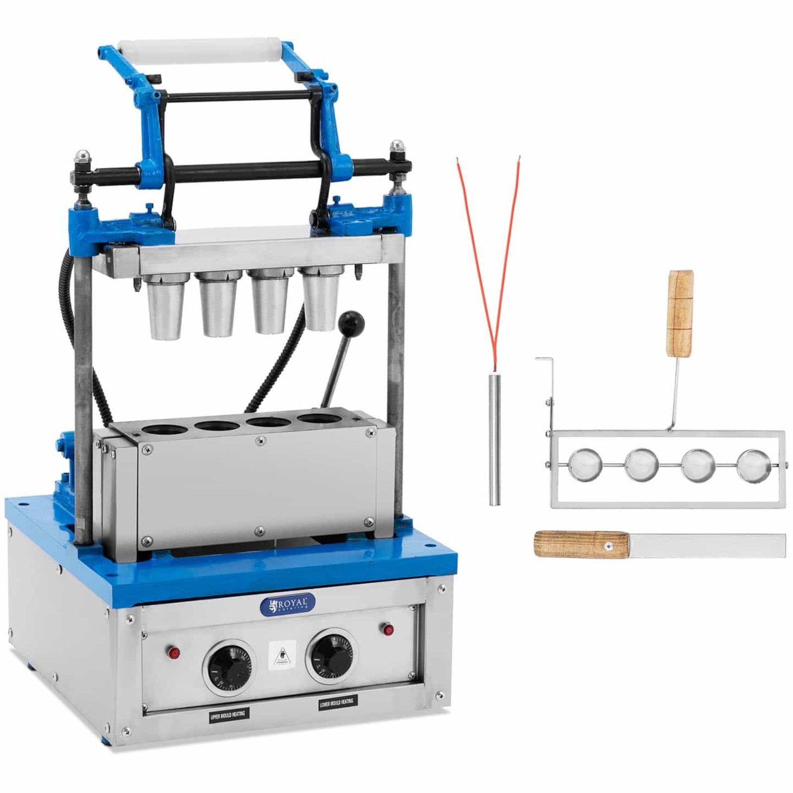 Waflownica marki Royal Catering dzięki swojej mocy 2400 W pozwala wytworzyć 100-120 wafli / godzinę. W zależności od tego jak chrupiące mają być rożki ich pieczenie zajmuje od 1 do 2 min. Wafle do lodów produkowane są w klasycznym stożkowym kształcie i mają wymiary 55 x 70 mm. Użytkowanie, czyszczenie i konserwacja maszyny do wafli przebiega łatwo i intuicyjnie. Dołączona miarka ułatwia tworzenie idealnych rożków lodowych. Urządzenie wykonane zostało z trwałych i odpornych materiałów takich jak stal nierdzewna, żeliwo, stal i aluminium.