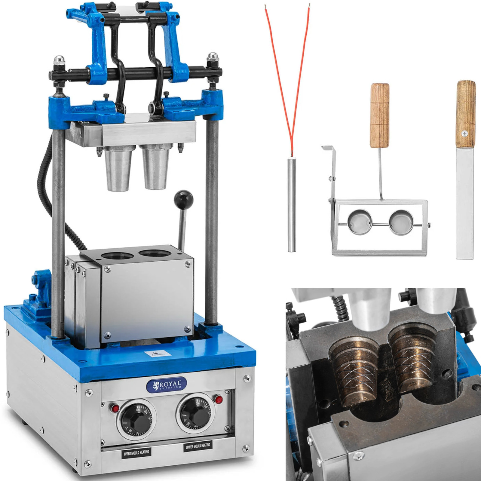 Waflownica marki Royal Catering dzięki swojej mocy 1500 W pozwala wytworzyć 50-60 wafli / godzinę. W zależności od tego jak chrupiące mają być rożki ich pieczenie zajmuje od 1 min. Wafle do lodów produkowane są w klasycznym stożkowym kształcie i mają wymiary 55 x 70 mm. Użytkowanie, czyszczenie i konserwacja maszyny do wafli przebiega łatwo i intuicyjnie. Dołączona miarka ułatwia tworzenie idealnych rożków lodowych. Urządzenie wykonane zostało z trwałych i odpornych materiałów takich jak stal nierdzewna, żeliwo, stal i aluminium.
