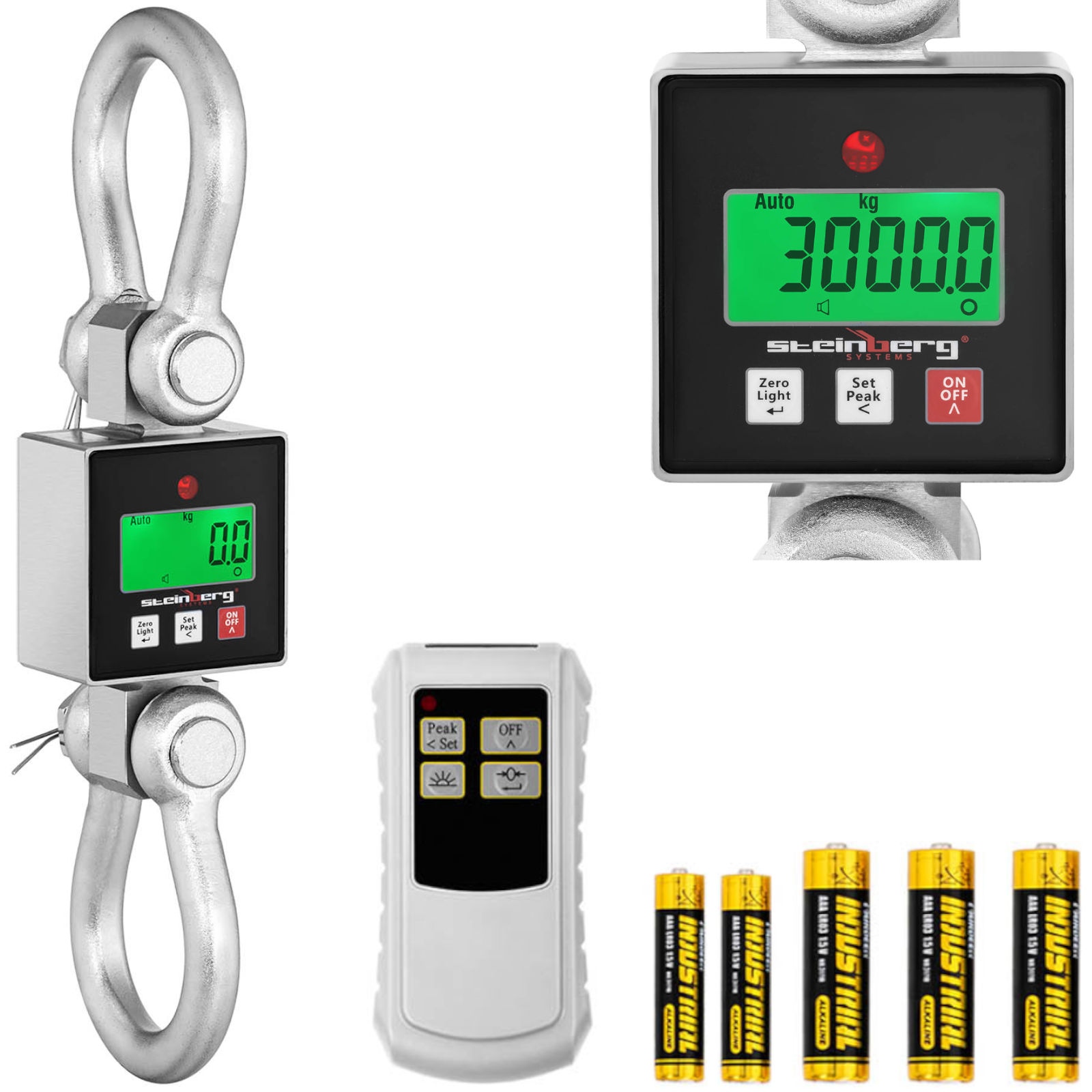 Waga hakowa niemieckiej marki Steinberg Systems nadaje się do ładunków ważących maks. 3000 kg. Sprawdzi się dzięki temu w portach, na lotniskach, w fabrykach, magazynach, warsztatach, placówkach pocztowych, na placach budowy, a nawet w ogrodach zoologicznych. Wysoka precyzja 1 kg lub 0,5 kg sprawia, że uzyskasz dokładny wynik. Odczytasz go z podświetlanego wyświetlacza LCD. Do wyboru masz 2 jednostki ważenia: kg i lb. Wygodną obsługę zapewnia pilot zdalnego sterowania o zasięgu 5 m. Waga hakowa jest zasilana bateriami 3 x AA. Wyłącza się automatycznie po 10 minutach bezczynności.