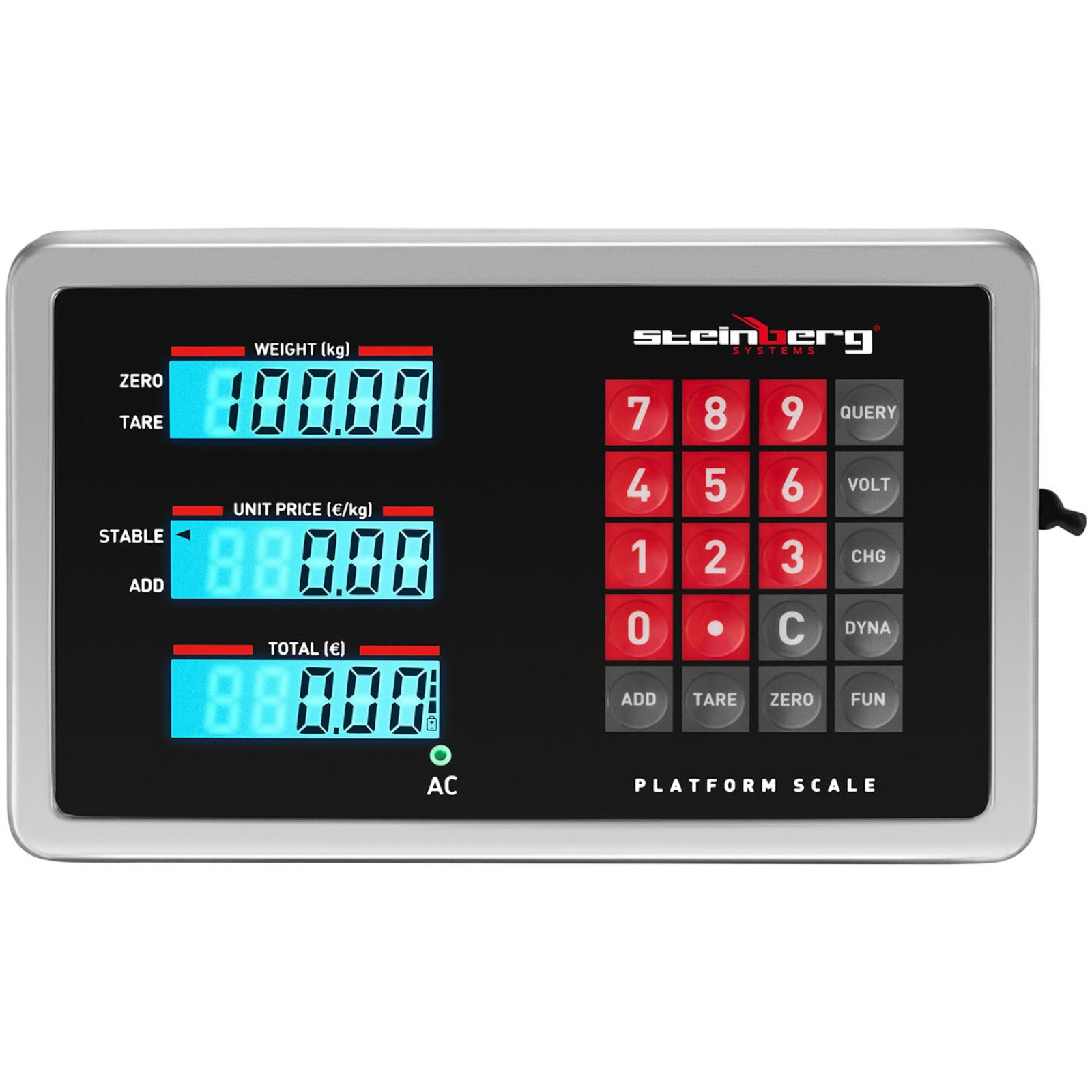 Waga platformowa marki Steinberg Systems sprawdzi się zarówno w użytku profesjonalnym jak i prywatnym. Bezprzewodowy panel sterowania pozwala na wygodne użytkowanie. Waga posiada zakres ważenia 0,2-100 kg z dokładnością do 0,01 kg. Wyniki wyświetlane są w kg lub funtach. Platforma ma wymiary 300 x 400 mm. Urządzenie waży, dodaje wyniki kilku pomiarów, zeruje. Waga wyposażona w akumulator działa przez 40 godzin. W zestawie znajduje się przewód ładujący o długości 1,2 m. Może być także używana stacjonarnie z podłączonym zasilaczem. Wyświetlacz LCD umożliwia łatwy odczyt pomiarów.