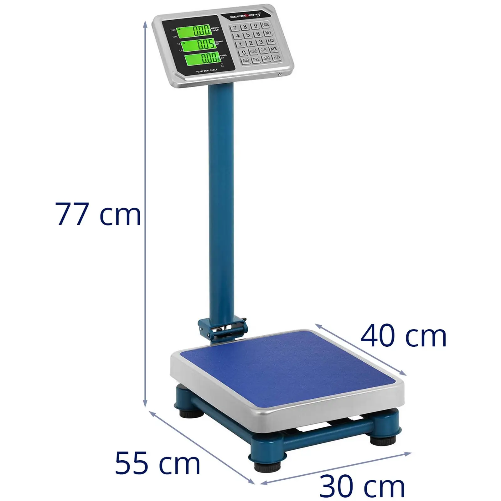 Waga platformowa marki Steinberg Systems sprawdzi się do wyposażenia poczty, magazynu, sklepu, punktu logistycznego, zakładu produkcyjnego, fabryki lub warsztatu. Odznacza się solidnością i wysoką jakością wykonania, co przekłada się na długą, intensywną eksploatację. Waga pozwala zważyć produkty w zakresie 0,4-100 kg z wysoką dokładnością 20 g. Duża platforma 30 x 40 cm nadaje się do określania wagi zarówno mniejszych paczek, jak i większych gabarytowo przesyłek. W przypadku przeciążenia wyświetli się stosowny komunikat. Urządzenie wyposażono w opcje: określenia ceny, tarowania, zerowania, zliczania sztuk, dodawania, kalibracji, resetowania, a także zmiany jednostek (kg, Ib). Łatwa obsługa wynika z 3 umieszczonych na terminalu wyświetlaczy LCD (okno wagi, ceny i całkowitej kwoty). Posiadają one podświetlenie, a wysokie na 15 mm cyfry są bardzo czytelne. Energooszczędne urządzenie wyłącza się po 3 s nieużywania. Po naładowaniu (można korzystać z wagi w jego trakcie) bateria zapewnia pracę do 96 h. Przekłada się to na wyjątkową mobilność. W zestawie znajduje się zasilacz 7 V / 500 mA. Długą żywotność zagwarantowano dzięki użyciu wysokojakościowych materiałów: stali nierdzewnej (platforma), stali malowanej proszkowo (rama), a także zabezpieczeniu klawiatury przed wodą i tłuszczem. Stabilna konstrukcja wspiera się na 4 regulowanych nóżkach. Statyw w razie potrzeby można złożyć, co usprawnia transport.