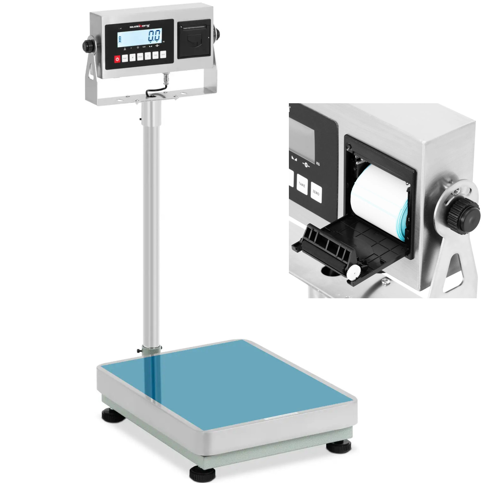 Wagę platformową z drukarką etykiet marki Steinberg Systems można wykorzystać mobilnie lub stacjonarnie do sprawdzania masy lekkich i ciężkich ładunków oraz określania ich dokładnej wagi. Dzięki kompaktowym wymiarom i powierzchni ważenia 50 x 40 cm wagę można bez problemu postawić nawet miejscach o małej przestrzeni. Waga podłogowa oferuje zakres pomiarowy do 300 kg i umożliwi precyzyjne ważenie z dokładnością do 10 g. Wyświetlacz posiada alarm, który poinformuje o przeciążeniu. Waga przemysłowa sprawdzi się jako narzędzie pomiarowe w magazynach, hurtowniach, sklepach, na targowiskach i nie tylko. Wszystkie wartości można odczytać na panelu sterowania z podświetlanym ekranem LCD. Dzięki funkcjom tarowania, liczenia, sumowania i zerowania wagę platformową można wykorzystać na wiele sposobów. Aby uzyskać szybki podgląd, wystarczy użyć zintegrowanej drukarki, która zapisze na etykiecie masę netto i brutto, tarę oraz datę i godzinę. Antypoślizgowe nóżki zadbają o stabilność podczas ważenia. Można określić ich wysokość i dostosować do podłoża. Za pomocą zintegrowanej poziomicy można sprawdzić, czy waga podłogowa jest ustawiona równo. Waga platformowa wyróżnia się wysoką jakością wykonania i trwałymi materiałami, takimi jak stal nierdzewna (powierzchnia ważąca) czy stal węglowa (uchwyt wyświetlacza).