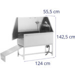Wanna groomerska marki PHYSA idealnie nadaje się do wszystkich salonów czy gabinetów zajmujących się pielęgnacją lub opieką zwierząt. Kompletny zestaw zawiera węże przyłączowe i odpływowe (GL/2 / 60 cm każdy), baterię z zaworem ceramicznym, którym można ustawić temperaturę wody w zakresie od 0 do 90 °C, słuchawkę prysznicową o szerokości 10 cm i długości 24 cm z 3 poziomami ciśnienia z elastycznym wężem długości 1,7 m oraz stojak na szampon o wymiarach 24,5 x 11 x 5,5 cm, Antypoślizgowe gumowe nóżki zapewniają stabilność przez cały czas pracy w myjce, dodatkowo chroniąc podłogę przed zarysowaniami. Wanna wyposażona jest w wyjmowaną kratkę antypoślizgową, która zapobiega staniu łapami zwierzęcia w wodzie, składaną rampę i wyjątkowo szczelne drzwi zapewniające każdemu zwierzakowi do 60 kg łatwy i bezpieczny dostęp do wnętrza wanny. Całkowicie spawana, jednoczęściowa wanna wykonana ze stali nierdzewnej ma gładkie powierzchnie, które są łatwe do czyszczenia, zapewniając zawsze profesjonalny wygląd.
