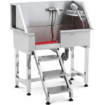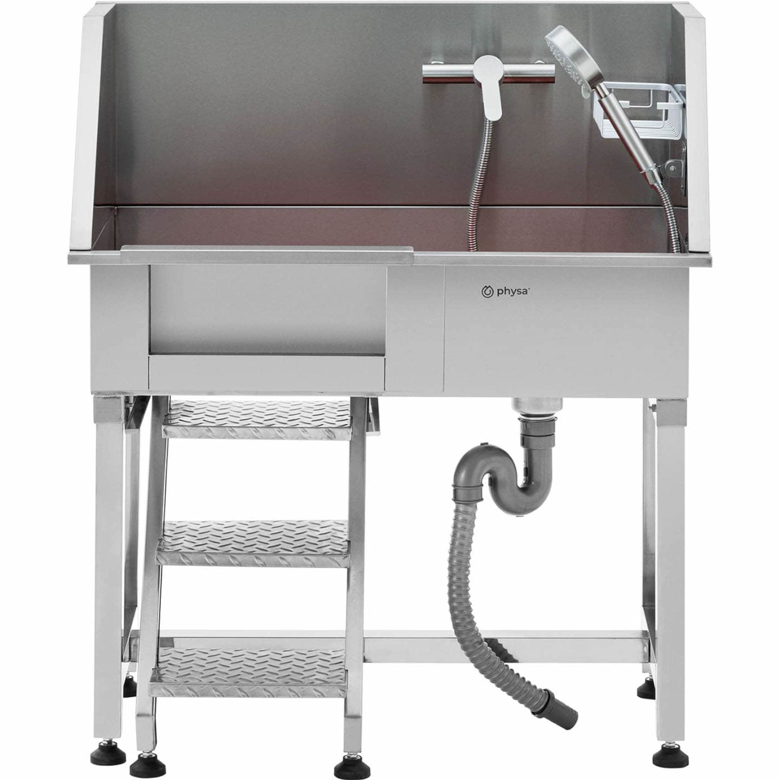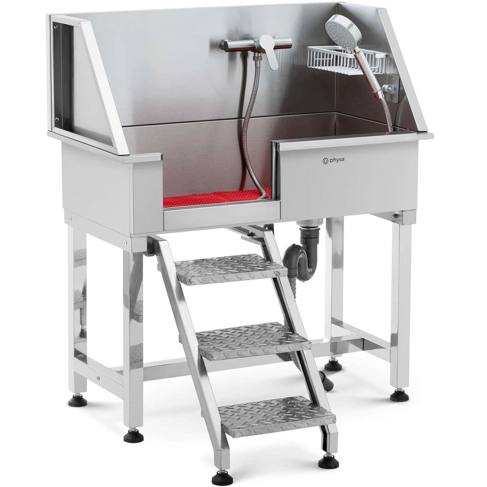 Wanna groomerska marki PHYSA idealnie nadaje się do wszystkich salonów czy gabinetów zajmujących się pielęgnacją lub opieką zwierząt. Kompletny zestaw zawiera węże przyłączowe i odpływowe (GL/2 / 60 cm każdy), baterię z zaworem ceramicznym, którym można ustawić temperaturę wody w zakresie od 0 do 90 °C, słuchawkę prysznicową o szerokości 10 cm i długości 24 cm z 3 poziomami ciśnienia z elastycznym wężem długości 1,7 m oraz stojak na szampon o wymiarach 24,5 x 11 x 5,5 cm, Antypoślizgowe gumowe nóżki zapewniają stabilność przez cały czas pracy w myjce, dodatkowo chroniąc podłogę przed zarysowaniami. Wanna wyposażona jest w wyjmowaną kratkę antypoślizgową, która zapobiega staniu łapami zwierzęcia w wodzie, składane schody i wyjątkowo szczelne przesuwne drzwi zapewniające każdemu zwierzakowi do 60 kg łatwy i bezpieczny dostęp do wnętrza wanny. Całkowicie spawana, jednoczęściowa wanna wykonana ze stali nierdzewnej ma gładkie powierzchnie, które są łatwe do czyszczenia, zapewniając zawsze profesjonalny wygląd.