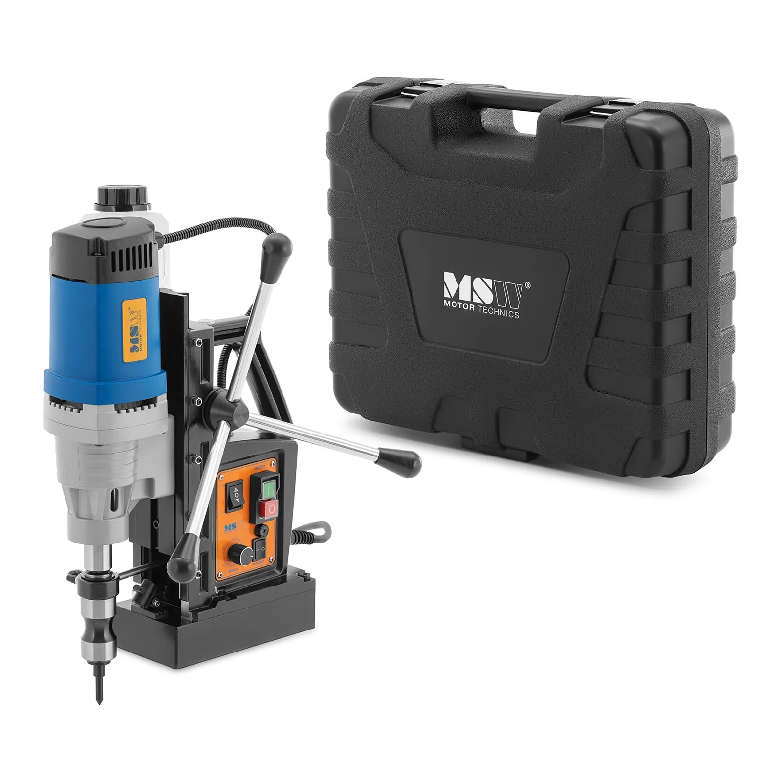 Wiertarka magnetyczna marki MSW nadaje się do wiercenia, pogłębiania, gwintowania i wiercenia pierścieniowego – idealna do przemysłowej i komercyjnej obróbki metali. Nie ma znaczenia, czy pracujesz w pionie, czy w poziomie. Mocna stopa elektromagnetyczna bezpiecznie utrzymuje maszynę w żądanej pozycji. Moc urządzenia wynosi 1300 W. Możesz regulować prędkość bezstopniowo do 475 obr./min. Do nacinania gwintów możesz odwrócić kierunek obrotów. Niezawodnie zapobiega to uszkodzeniu świeżo naciętego gwintu podczas odkręcania. Wszystkich ustawień dokonuje się na wygodnym panelu sterowania. Głębokość wiercenia zmieniana jest za pomocą trójramiennego pokrętła. Dzięki dużemu zakresowi skoku od 0 do 175 mm możesz pracować niezwykle elastycznie. Zintegrowana poziomica pozwala ocenić pozycję wiertła. Wiertarka posiada również zintegrowany zbiornik chłodziwa. W przypadku prostych zadań napełnij pojemnik 0,3 l wodą z kranu. Do bardziej wymagających otworów stosuj specjalne chłodziwo lub olej do wiercenia. Wydłuża to żywotność wierteł i minimalizuje prace konserwacyjne. Maksymalna siła przyciągania wynosi 18000 N – odpowiada to masie prawie 2 t – magnes umożliwia również pracę na cieńszych materiałach. Zawarty w zakresie dostawy pasek mocujący zapewnia dodatkowe zabezpieczenie. Na przykład w przypadku awarii zasilania zapobiega zranieniu się lub uszkodzeniu obrabianego przedmiotu. Urządzenie wyposażono także w wyłącznik magnetyczny RCD. Jeśli napęd zostanie przypadkowo włączony po awarii zasilania lub odłączeniu od sieci, silnik nadal nie ruszy. Ponowne działanie jest możliwe dopiero po uruchomieniu przełącznika magnetycznego. W zestawie znajdują się: uchwyt wiertarski do chwytów o średnicy do 16 mm, zbiornik chłodziwa, zapasowe szczotki węglowe, uchwyt MK3 / chwyt Weldon 19 mm, bezpieczniki, wszystkie narzędzia montażowe i wiele innych przydatnych elementów. Całość zapakowana w poręczną walizkę.