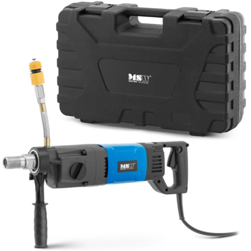 Wiertnica do betonu marki MSW pozwoli na wywiercenie otworów w twardych materiałach, takich jak beton, mur lub asfalt. Jeśli podczas wiercenia używa się statywu wiertniczego (brak w zestawie), można zrobić duże otwory o średnicy do 165 mm. Wiertnica ma moc 1900 W i maksymalną prędkość 2170 obr./min. Są to idealne wartości do ręcznego wiercenia rdzeniowego otworów do średnicy 100 mm. Aby uzyskać najlepsze wyniki, należy użyć dwóch poziomów mocy, a także wykorzystać wiertła o największej średnicy przy najniższej prędkości. Urządzenie posiada funkjce chłodzenia wodą podczas wiercenia. Złącze jest zintegrowane bezpośrednio z urządzeniem. Zmniejsza to zużycie wiertła, ogranicza konserwację maszyny i zapewnia dłuższą żywotność. Aby wymienić szczotki węglowe, wystarczy zdjąć osłonę ochronną. Diamentowe wiertła rdzeniowe o różnych średnicach bezpiecznie mocuje się w urządzeniu za pomocą uchwytu. Wiertłem diamentowym można wiercić w betonie zbrojonym, cemencie, murze, asfalcie i kamieniu naturalnym. Przewód zasilający o długości 3,5 m zapewnia maksymalną swobodę ruchów. Dzięki wbudowanemu wyłącznikowi różnicowoprądowemu (PRCD – Portable Residual Current Device) można zawsze bezpiecznie korzystać z urządzenia. W przypadku zwarcia następuje natychmiastowe zatrzymanie pracy.