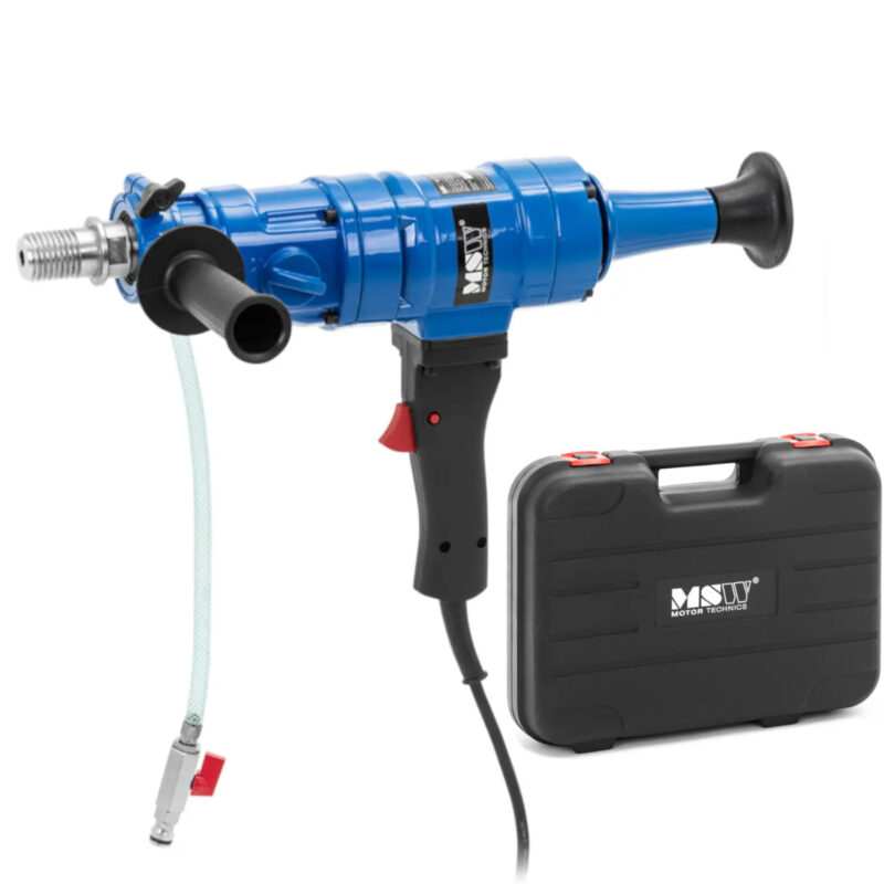 Wiertnica do betonu marki MSW pozwoli na wycinanie otworów w twardych materiałach budowlanych, takich jak beton, mur czy asfalt. Charakteryzuje się wyjątkowo niską emisją wibracji, co zapewnia precyzję wiercenia. Wiertarkę rdzeniową można zabrać ze sobą na plac budowy w poręcznej walizce i użyć jej do precyzyjnego wiercenia w każdej sytuacji. Ręczna wiertnica diamentowa zapewnia moc 1500 W i maksymalną prędkość obrotową 2100 obr./min. Są to idealne wartości do uzyskania otworów o średnicy do 102 mm. Dzięki niskiemu zużyciu energii można wykorzystać ją nawet z agregatem prądotwórczym. Aby uzyskać precyzyjne wyniki wiercenia, należy wykorzystać wbudowaną poziomicę i dodatkowy uchwyt boczny. Do dyspozycji są też są różne poziomy mocy zapewniające optymalne wyniki. Dzięki temu można użyć wierteł o największej średnicy przy najniższej prędkości. Podczas wiercenia można polegać na niezawodnym chłodzeniu wodą. Złącze wykonane z wysokiej jakości kutej stali jest zintegrowane bezpośrednio z wiertarką rdzeniową. Zastosowanie wody znacząco ogranicza zużycie wiertła. Maszyna wymaga więc mniej konserwacji i ma dłuższą żywotność. Zmniejsza się również ilość pyłu powstającego podczas wiercenia, a wiertło rdzeniowe mniej się nagrzewa. Kabel zasilający o długości 2,19 m zapewnia maksymalną swobodę ruchów. Dzięki zintegrowanemu wyłącznikowi różnicowoprądowemu (PRCD – Portable Residual Current Device) można zawsze bezpiecznie korzystać z urządzenia. Jeśli dojdzie do zwarcia w okolicy wiertnicy do betonu lub przewodu, praca zostanie natychmiast zatrzymana.