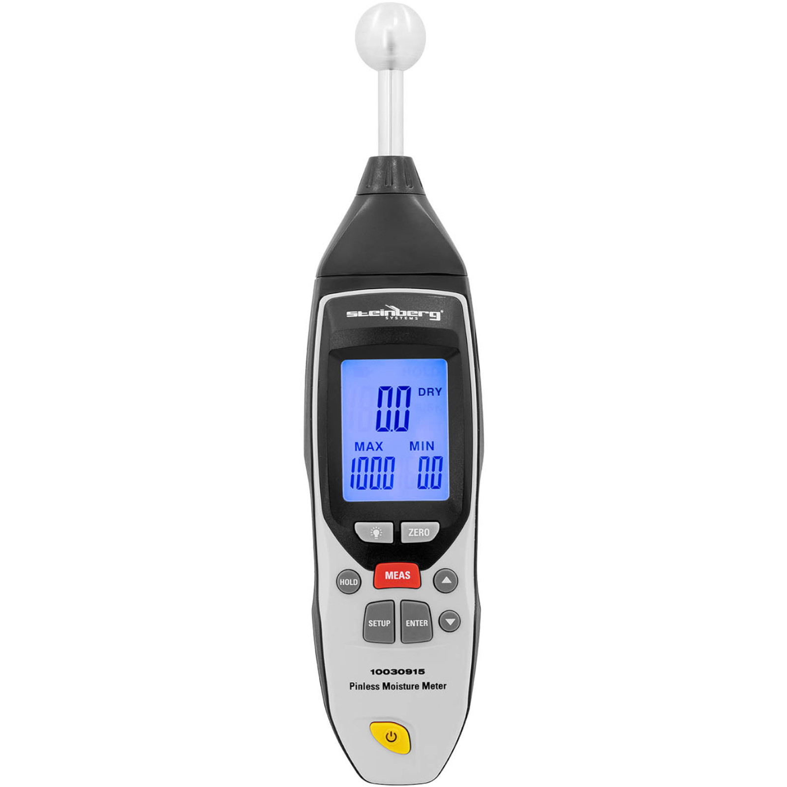 Wilgotnościomierz marki Steinberg Systems pozwoli szybko i niezawodnie zmierzyć wilgotność materiałów budowlanych, takich jak cement, jastrych, cegły. Za sprawa sondy kulkowej pomiar jest bezinwazyjny, powierzchnia nie ulega uszkodzeniu. Wilgotność materiałów określana jest w zakresie 0-100%, na głębokości pomiaru od 20 do 40 mm. Dokładność pomiarowa urządzenia wynosi 0,1 %. Urządzenie obsługiwane jest za pomocą kilku przycisków. Podświetlany wyświetlacz LCD czytelnie pokazuje zmierzone wartości. Ustawić można minimum i maksimum a także odczytać zmierzone wartości przy pomocy funkcji hold. Krytyczne wartości pomiaru wyzwalają funkcję alarmu. Urządzenie wykonane zostało z wysokiej jakości tworzywa sztucznego. Zasilane jest baterią 9 V i posiada funkcję automatycznego wyłączania. Wskaźnik naładowania baterii pozwala kontrolować poziom energii do pracy. W komplecie znajduje się futerał, ułatwiający transport i przechowywanie