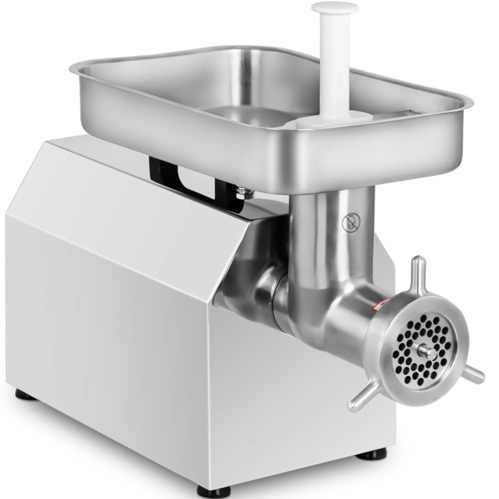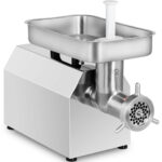 Wilk do mięsa marki Royal Catering to profesjonalne urządzenie, które sprawdzi się w barach, restauracjach, sklepach mięsnych czy masarniach. Wydajny silnik o mocy 1100 W pozwala sprawnie zmielić aż 420-480 kg mięsa w ciągu godziny. Wilk charakteryzuje się stosunkowo cichą pracą wynoszącą 70 dB. Urządzenie wyposażone zostało w obroty wsteczne, pomagające w przypadku utknięcia mięsa. Gumowe nóżki zapewniają stabilność. Elementy obudowy, sitka i nóż wykonane zostały ze stali nierdzewnej, popychacz z wysokiej jakości tworzywa sztucznego. W komplecie znajdują się dwa sitka o wymiarach oczek śr. 4,5 i 8 mm oraz popychacz.