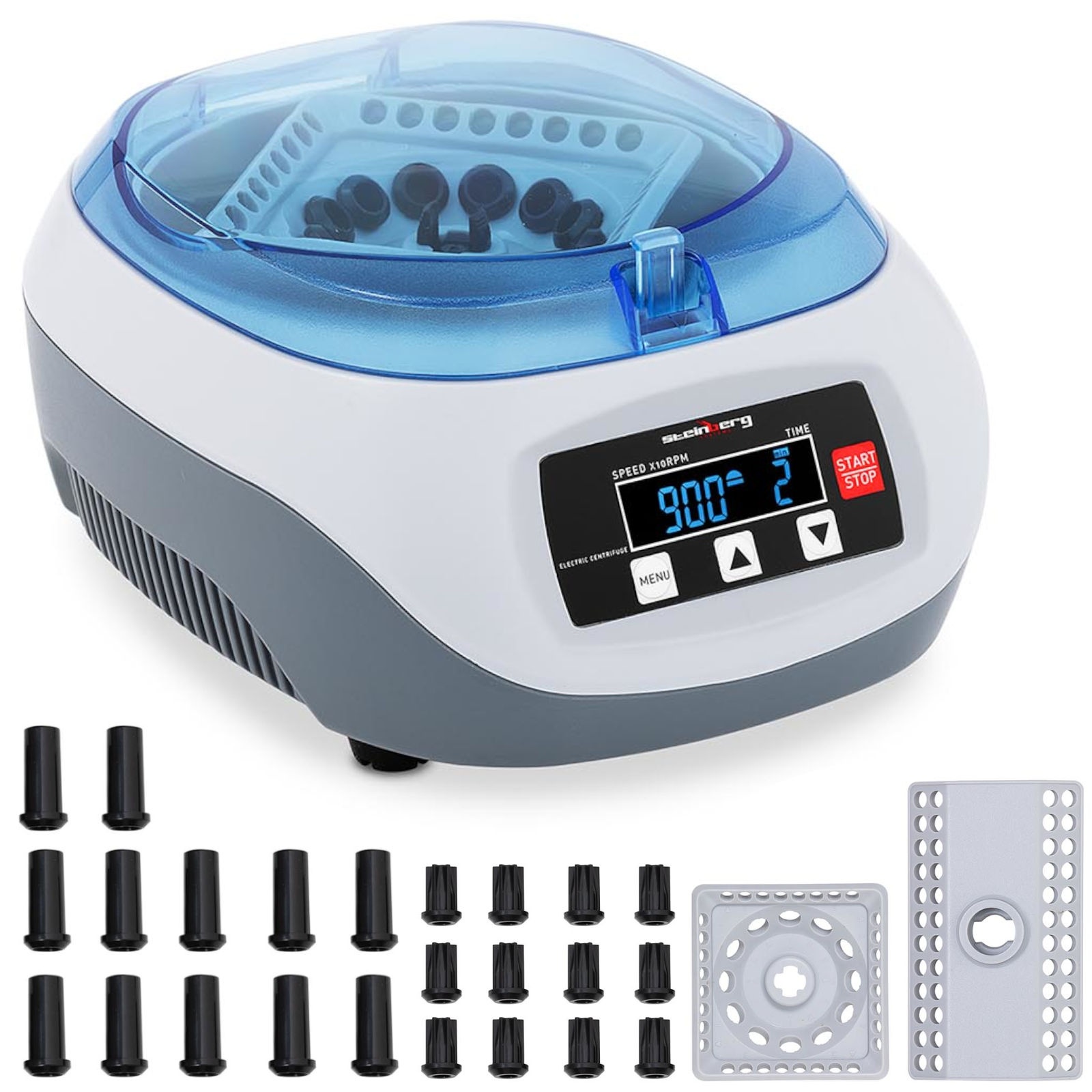 Wirówka laboratoryjna marki Steinberg Systems jest pomocnym urządzeniem naukowym i znajdzie zastosowanie w laboratoriach przemysłowych, ośrodkach badawczych oraz placówkach edukacyjnych. Napęd elektryczny ma moc 45 W. Za pomocą dwóch rotorów przystosujesz urządzenie do 12 probówek 1,5 / 2 ml oraz 4 pasków z 8 probówkami do PCR lub do 48 probówek po 0,2 ml. Ponadto po zastosowaniu adapterów pierwszy wirnik może pomieścić probówki 0,2 i 0,5 mm. Za sprawą mikroprocesora prędkość można regulować w zakresie od 500 do 12000 obr./min. Z kolei generowane względne maksymalne przyspieszenie odśrodkowe wynosi 5960 g. Sprzęt posiada timer, który można ustawić w zakresie 1-99 minut. Wszystkie wartości są wyraźnie pokazane na wyświetlaczu LCD i można je ustawić za pomocą przejrzystego panelu sterowania.