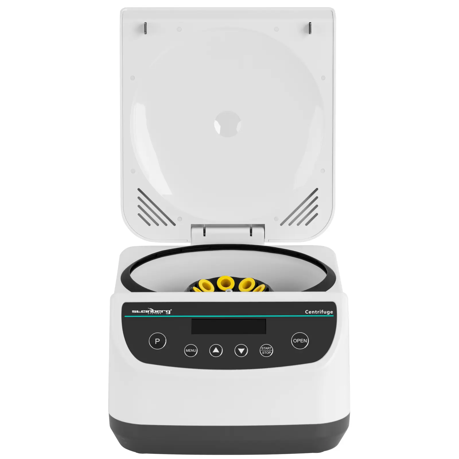 Wirówka laboratoryjna marki Steinberg Systems umożliwia przeprowadzanie precyzyjnych badań i zapewnia profesjonalne wsparcie dla szerokiego zakresu zadań. Urządzenie ma napęd elektryczny o mocy 60 W. Wbudowany rotor przetwarza jednocześnie osiem probówek o pojemności do 15 ml. Prędkość obrotowa ustawiana jest w zakresie od 500 do 4000 obr./min za pomocą mikroprocesora. Dzięki temu osiągane jest maksymalne względne przyspieszenie odśrodkowe wynoszące 2075 xg. Regulowana prędkość pozwala uzyskać odpowiednią siłę odśrodkową i niezawodnie oddzielić cząstki stałe od cieczy, którą następnie można zdekantować. Przezroczysta wkładka w pokrywie umożliwia stały podgląd próbek. Pokrywa zamyka się automatycznie podczas pracy i otwiera ponownie dopiero po zatrzymaniu wirnika. Po upływie ustawionego czasu rozlega się sygnał dźwiękowy. Wirówka posiada izolację wibracyjną oraz zabezpieczenie przed przegrzaniem. Timer określa czas pracy od 30 sekund do 59 minut. Wszystkie wartości ustawiane są za pomocą panelu sterowania, i widoczne na czytelnym wyświetlaczu cyfrowym. Dziewięć miejsc pamięci dla wstępnie ustawionych wartości ułatwia obsługę wirówki.