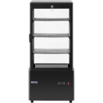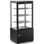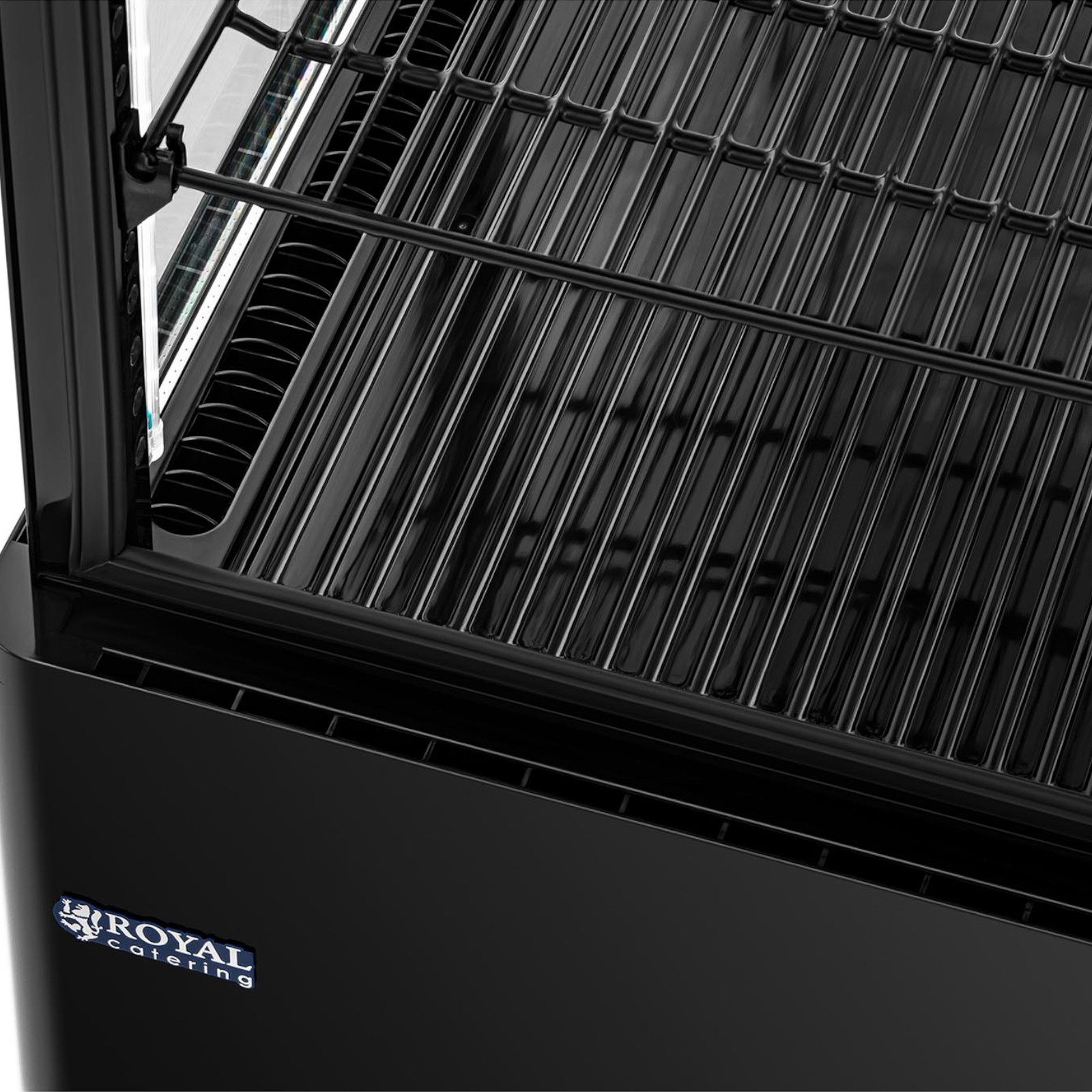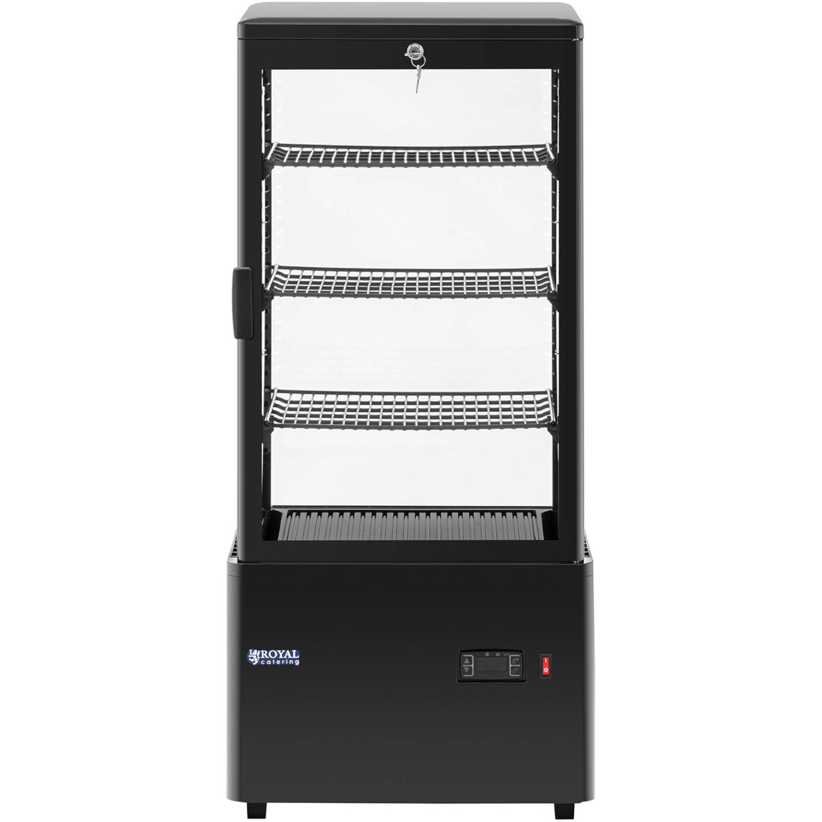 Witryna chłodnicza marki Royal Catering idealnie nadaje się do wyeksponowania artykułów gastronomicznych w kawiarni, bistro, bufecie w hotelu i wszędzie tam, gdzie jest potrzeba zaprezentowania artykułów spożywczych. Cztery poziomy z trzema półkami o wymiarach 38,5 x 32,5 cm oferują dużą powierzchnię do prezentacji produktów w chłodziarce, o pojemności 78 l. Przeszklona witryna wykonana ze szkła hartowanego oraz zintegrowane oświetlenie LED zapewnia doskonały widok produktów dla klientów z każdej strony. Chłodziarkę można łatwo uzupełnić przez zamykane drzwi na klucz, które dodatkowo chronią zawartość przed niepowołanym dostępem, a cyfrowy termostat reguluje zakres temperatury od 2 do 10 °C zapewniając optymalną kontrolę dla większości potraw i napojów. Przestronna witryna chłodnicza stabilnie stoi na czterech stabilnych nóżkach, które chronią podłogę przed zarysowaniami podczas przesuwania. Zastosowane materiały (plastik, szkło) są szczególnie łatwe w pielęgnacji, co jest szczególnie ważne w dziale gastronomii.