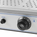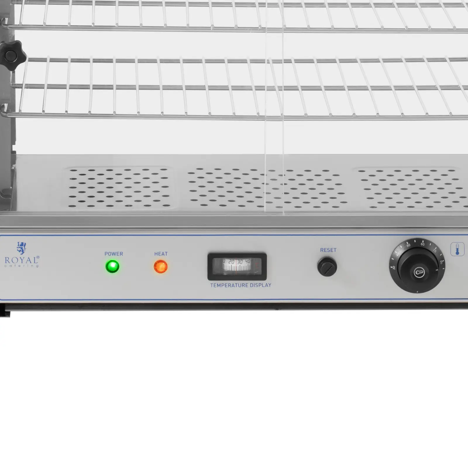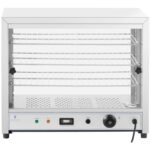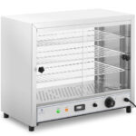 Witryna grzewcza marki Royal Catering jest idealna do utrzymywania ciepła i prezentowania różnych potraw. Sprzęt oferuje Twoim gościom zawsze świeże i gotowe do spożycia posiłki w formie bufetu w hotelu, kawiarni lub restauracji. We wnętrzu witryny grzewczej do pizzy znajdują się 3 półki do przechowywania i prezentowania wyrobów. Poziomy o rozstawie równym 9 cm są wkładane po bokach w szyny zintegrowane z wnętrzem obudowy. W razie potrzeby odległość między półkami można zmienić. Każda półka oferuje dużo miejsca dzięki wymiarom 56,6 x 30 cm. Wnętrze lady grzewczej można ogrzać do temperatury w zakresie 30-85°C za pomocą szybkiego i wydajnego elementu grzejnego o mocy 1000 W. Do ustawiania temperatury służy wygodny panel sterowniczy. Sprzęt wyposażono w precyzyjny termostat. Prostopadłościenny kształt witryny zapewnia więcej miejsca na jedzenie niż wiele skośnych modeli. Obudowa wykonana jest z wytrzymałej stali nierdzewnej. Przód i tył wykonano z hartowanego szkła. Front otwierany jest za pomocą dwojga przesuwnych szklanych drzwi, które zajmują niewiele miejsca. Rozwiązanie ułatwia wyjmowanie i uzupełnianie żywności. W dolnej części obudowy znajduje się szuflada na resztki jedzenia. Można ją łatwo wyjąć, co usprawnia czyszczenie. Dzięki gładkim szklanym powierzchniom oraz zastosowaniu stali nierdzewnej nie są wymagane żadne specjalne detergenty.