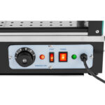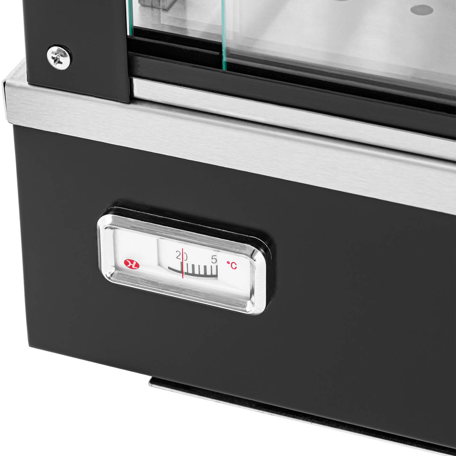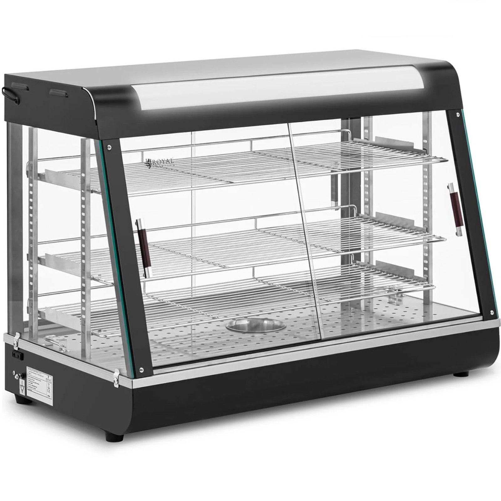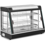 Witryna grzewcza marki Royal Catering sprawdzi się do utrzymywania w cieple i prezentowania potraw takich jak pizza, ciasta czy kanapki. Urządzenie ma pojemność 150 l. Trzy półki można wygodnie ustawić na 21 różnych wysokościach. Co 1,5 cm znajdują się uchwyty, dzięki którym można podzielić wnętrze według własnych potrzeb. Wymiary półek wynoszą 82 x 34, 82 x 32, 82 x 29,5 cm. Moc sprzętu 1600 W umożliwia szybkie nagrzewanie wnętrza do temperatury 85°C. Intuicyjny panel sterowania pozwala łatwo nastawić temperaturę. Zintegrowana miska na wodę zapobiega wysychaniu ciepłego jedzenia. Obudowę witryny wykonano ze stali, panele boczne ze szkła hartowanego. Drzwi przesuwne oszczędzają miejsce. Szuflada na okruchy w dolnej części pozwala zachować porządek.