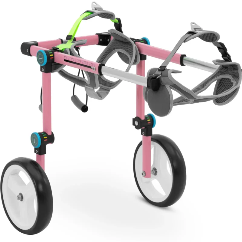 Wózek inwalidzki dla psa marki Wiesenfield pomoże małym pupilom stanąć na nogi. Niezależnie od tego, czy chodzi o zwierzęta ranne, czy sparaliżowane, dzięki chodzikowi dla psa można wesprzeć zdrowie czworonoga i pomóc mu pozostać aktywnym, biegać i bawić się. Wózek inwalidzki jest odpowiedni dla psów z ograniczeniami w tylnych łapach. Model składa się z lekkiej ramy umieszczonej przed klatką piersiową oraz pasa unoszącego tył. Chodzik łatwo założyć w ciągu kilku minut. Należy postawić psa w wózku rehabilitacyjnym, a następnie wyregulować szerokość, długość i wysokość tak, aby zwierzę siedziało prawidłowo i wygodnie. Wózek dla psów posiada dwa duże koła wykonane z elastycznego tworzywa EVA. Koła płynnie toczą się po różnych powierzchniach i pozwalają psu swobodnie się poruszać. Nylonowy pas w tylnej części unosi środek ciała psa i koryguje postawę dzięki podwyższonej pozycji. Zmniejsza to nacisk na plecy i sprawia, że zwierzę jest bardziej mobilne. Wysokiej jakości wózek inwalidzki wykonany jest z wytrzymałych i łatwych w pielęgnacji materiałów, które znoszą nawet intensywne użytkowanie. Waga aluminiowej ramy sprawia, że pies może niemal nie odczuje jej ciężaru, przez co może swobodnie poruszać się w wózku. Należy powoli przyzwyczajać psa do wózka inwalidzkiego, dać mu czas, którego potrzebuje i zachęcać do robienia małych kroków naprzód.