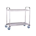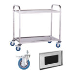 Wózek kelnerski wykonany w całości ze stali nierdzewnej posiada dwie półki o maksymalnym obciążeniu 160 kg.