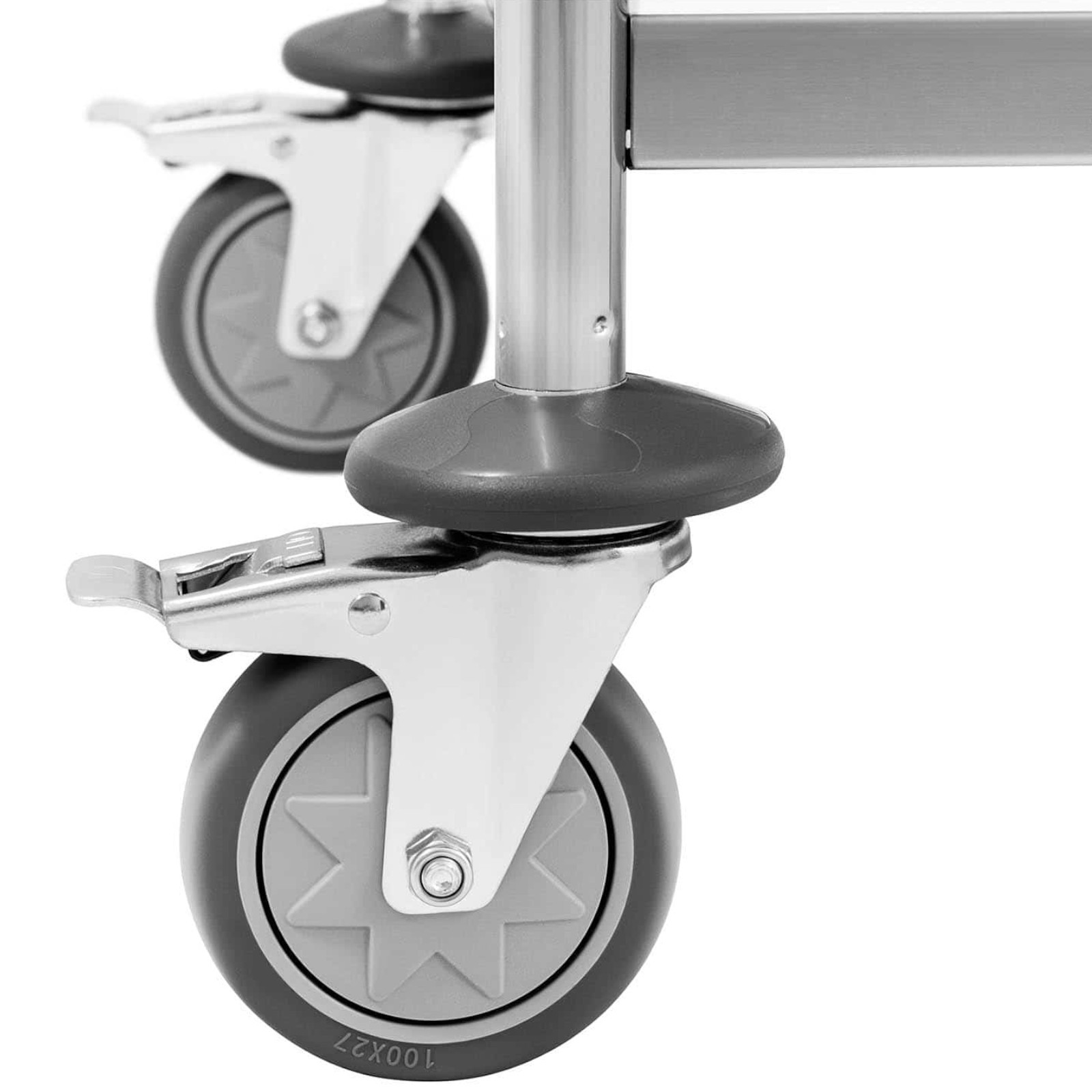 - – Cztery ciche i obracane o 360° gumowe kółka z 2 hamulcami postojowymi i odbojnikami,