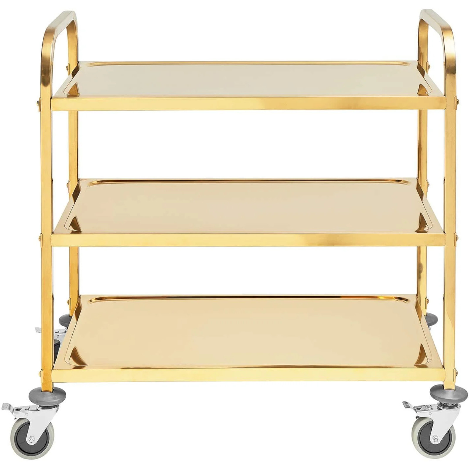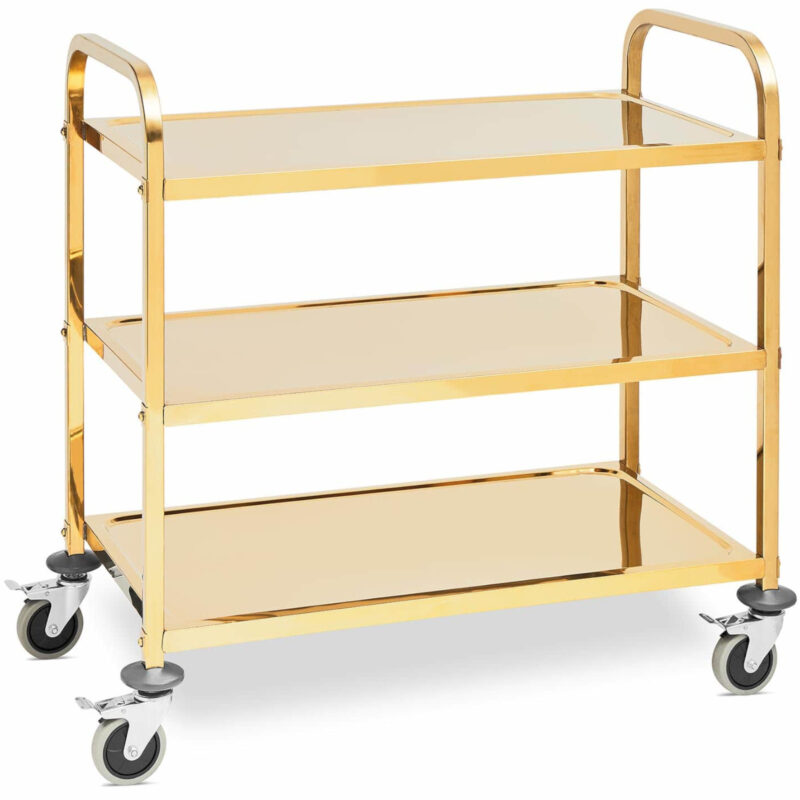 Wózek kelnerski marki Royal Catering sprawdzi się w stołówkach, dużych kuchniach, restauracjach, obiektach publicznych lub w miejscach prywatnych. Trzy półki 89,5 x 49,5 cm, każda o ładowności do 80 kg, (łącznie 240 kg) są łatwo dostępne ze wszystkich czterech stron. Odległość między nimi wynosi 270 mm, dzięki czemu jest miejsce na patelnie i większe garnki. Tace imponują specjalną konstrukcją przeciwwstrząsową: wibracje i hałas są pochłaniane przez gumowe maty antywibracyjne pod spodem. Gwarantuje to wygodną, bezpieczną i cichą pracę bez głośnego brzęku naczyń. Dodatkowo krawędzie na całym obwodzie chronią transportowane produkty przed zsunięciem się. Wózek wyposażono w cztery płynnie obracające się kółka, które można obracać o 360°, dzięki czemu można nim wygodnie manewrować nawet w ciasnych przestrzeniach. Nad kółkami znajdują się cztery nakładki ochronne, zapobiegające uszkodzeniu wózka, ścian lub mebli. Kółka wykonano z termoplastycznej gumy, wózek można bezgłośnie pchać po dowolnej podłodze, nawet przy pełnym obciążeniu: czy to płytki, parkiet czy drewniane deski podłogowe. Cztery hamulce postojowe blokują go przed niezamierzonym ruchem. Wózek wykonano z higienicznej i odpornej na korozję stali nierdzewnej. Materiał ten jest nie tylko wyjątkowo wytrzymały, ale również bardzo łatwy w pielęgnacji i trwały dzięki gładkiej powierzchni.